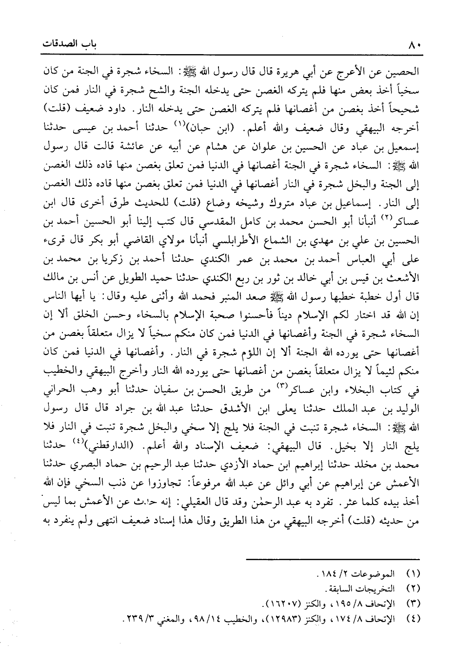 (ابْن حبَان) حَدَّثَنَا أَحْمَد بْن عِيسَى حَدَّثَنَا إِسْمَاعِيل بْن عُبَاد عَنِ الْحُسَيْن بْن علوان عَنْ هِشَام عَنْ أَبِيهِ عَن عَائِشَةَ قَالَتْ قَالَ رَسُول الله: السَّخَاءُ شَجَرَةٌ فِي الْجَنَّةِ أَغْصَانُهَا فِي الدُّنْيَا فَمَنْ تَعَلَّقَ بِغُصْنٍ مِنْهَا قَادَهُ ذَلِكَ الْغُصْنُ إِلَى الْجَنَّةِ وَالْبُخْلُ شَجَرَةٌ فِي النَّارِ أَغْصَانُهَا فِي الدُّنْيَا فَمَنْ تَعَلَّقَ بِغُصْنٍ مِنْهَا قَادَهُ ذَلِكَ الْغُصْنُ إِلَى النَّارِ.