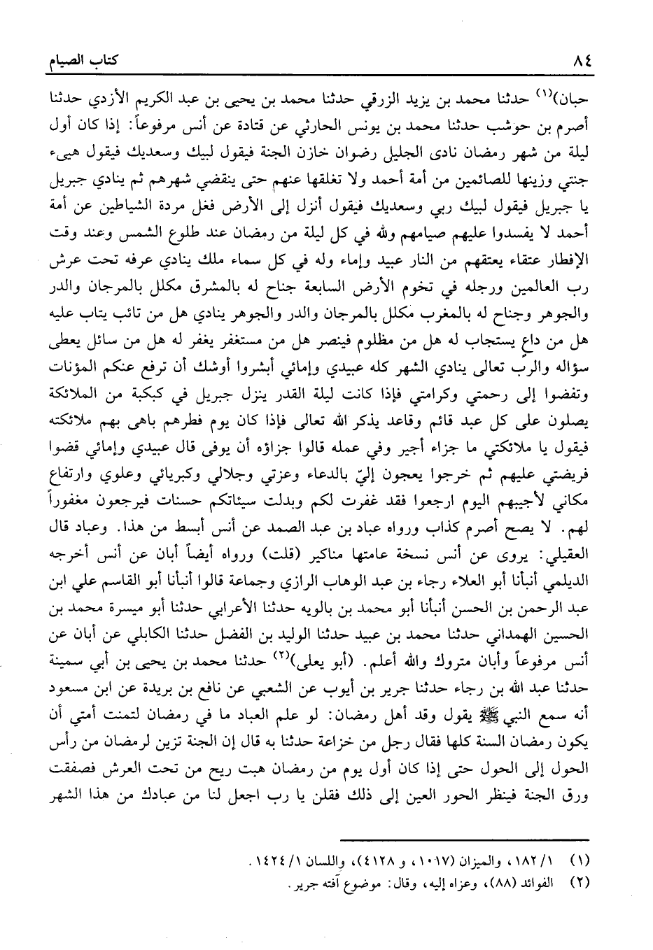 حَبَّان) حَدَّثَنَا مُحَمَّد بْن يَزِيد الزُّرَقي حَدَّثَنَا مُحَمَّد بْن يَحْيَى بْن عَبْد الْكَرِيم الْأَزْدِيّ حَدَّثَنَا أَصْرَم بْن حَوْشَب حَدَّثَنَا مُحَمَّد بْن يُونُس الْحَارِثِيّ عَنْ قَتَادَةَ عَن أَنَسٍ مَرْفُوعًا: إِذَا كَانَ أَوَّلُ لَيْلَةٍ مِنْ شَهْرِ رَمَضَانَ نَادَى الْجَلِيلُ رِضْوَانَ خَازِنَ الْجَنَّةِ فَيَقُول لبيْك وَسَعْديك فَيَقُول هيئء جَنَّتِي وَزَيِّنْهَا لِلصَّائِمِينَ مِنْ أُمَّةِ أَحْمَدَ وَلا تُغْلِقْهَا عَنْهُمْ حَتَّى يَنْقَضِيَ شَهْرُهُمْ ثُمَّ يُنَادِي جِبْرِيلَ يَا جِبْرِيلَ فَيَقُولُ لَبَّيْكَ رَبِّي وَسَعْدَيْكَ فَيَقُولُ أنْزِلَ إِلَى الأَرْضِ فَغُلَّ مَرَدَةَ الشَّيَاطِينِ عَنْ أُمَّةِ أَحْمَدَ لَا يُفْسِدُوا عَلَيْهِمْ صِيَامَهُمْ وَلِلَّهِ فِي كُلِّ لَيْلَةٍ مِنْ رَمَضَانَ عِنْدَ طُلُوعِ الشَّمْسِ وَعِنْدَ وَقْتِ الإِفْطَارِ عُتَقَاءُ يَعْتِقُهُمْ مِنَ النَّارِ عَبِيدٌ وَإِمَاءٌ وَلَهُ فِي كُلِّ سَمَاءٍ مَلَكٌ يُنَادِي عُرْفُهُ تَحْتَ عَرْشِ رَبِّ الْعَالَمِينَ وَرِجْلُهُ فِي تُخُومِ الأَرْضِ السَّابِعَةِ جَنَاحٌ لَهُ بِالْمَشْرِقِ مُكَلَّلٌ بِالْمُرْجَانِ وَالدُّرِّ وَالْجَوْهَرِ وَجَنَاحٌ لَهُ بِالْمَغْرِبِ مُكَلَّلٌ بِالْمَرْجَانِ وَالدُّرِّ وَالْجَوْهَرِ يُنَادِي هَلْ مِنْ تَائِبٍ يُتَابُ عَلَيْهِ هَلْ مِنْ دَاعٍ يُسْتَجَابُ لَهُ هَلْ مِنْ مَظْلُومٍ فَيُنْصَرُ هَلْ مِنْ مُسْتَغْفِرٍ يُغْفَرُ لَهُ هَلْ مِنْ سَائل يعْطى سُؤَاله وَالرَّبُّ تَعَالَى يُنَادِي الشَّهْرَ كُلَّهُ عَبِيدِي وَإِمَائِي أَبْشِرُوا أَوْشَكَ أَنْ تُرْفَعَ عَنْكُمُ الْمَؤنَاتُ وَتُفْضُوا إِلَى رَحْمَتِي وَكَرَامَتِي فَإِذَا كَانَتْ لَيْلَةُ الْقَدْرِ يَنْزِلُ جِبْرِيلُ فِي كَبْكَبَةٍ مِنَ الْمَلائِكَةِ يُصَلُّونَ عَلَى كُلِّ عَبْدٍ قَائِمٍ وَقَاعِدٍ يَذْكُرُ اللَّهَ تَعَالَى فَإِذَا كَانَ يَوْمُ فِطْرِهِمْ بَاهَى بِهِمْ مَلائِكَتَهُ فَيَقُولُ يَا مَلائِكَتِي مَا جَزَاءُ أَجِيرٍ وَفَّى عَمَلَهُ قَالُوا جَزَاؤُهُ أَنْ يُوَفَّى قَالَ عَبِيدِي وَإِمَائِي قَضَوْا فَرِيضَتِي عَلَيْهِمْ ثُمَّ خَرَجُوا يَعِجُّونَ إِلَيَّ بِالدُّعَاءِ وَعِزَّتِي وَجَلالِي وَكِبْرِيَائِي وَعُلُوِّي وَارْتِفَاعِ مَكَانِي لأُجِيبَهُمُ الْيَوْمَ ارْجِعُوا فَقَدْ غَفَرْتُ لَكُمْ وَبَدَّلْتُ سَيِّئَاتِكُمْ حَسَنَاتٍ فَيَرْجِعُونَ مَغْفُورًا لَهُمْ.