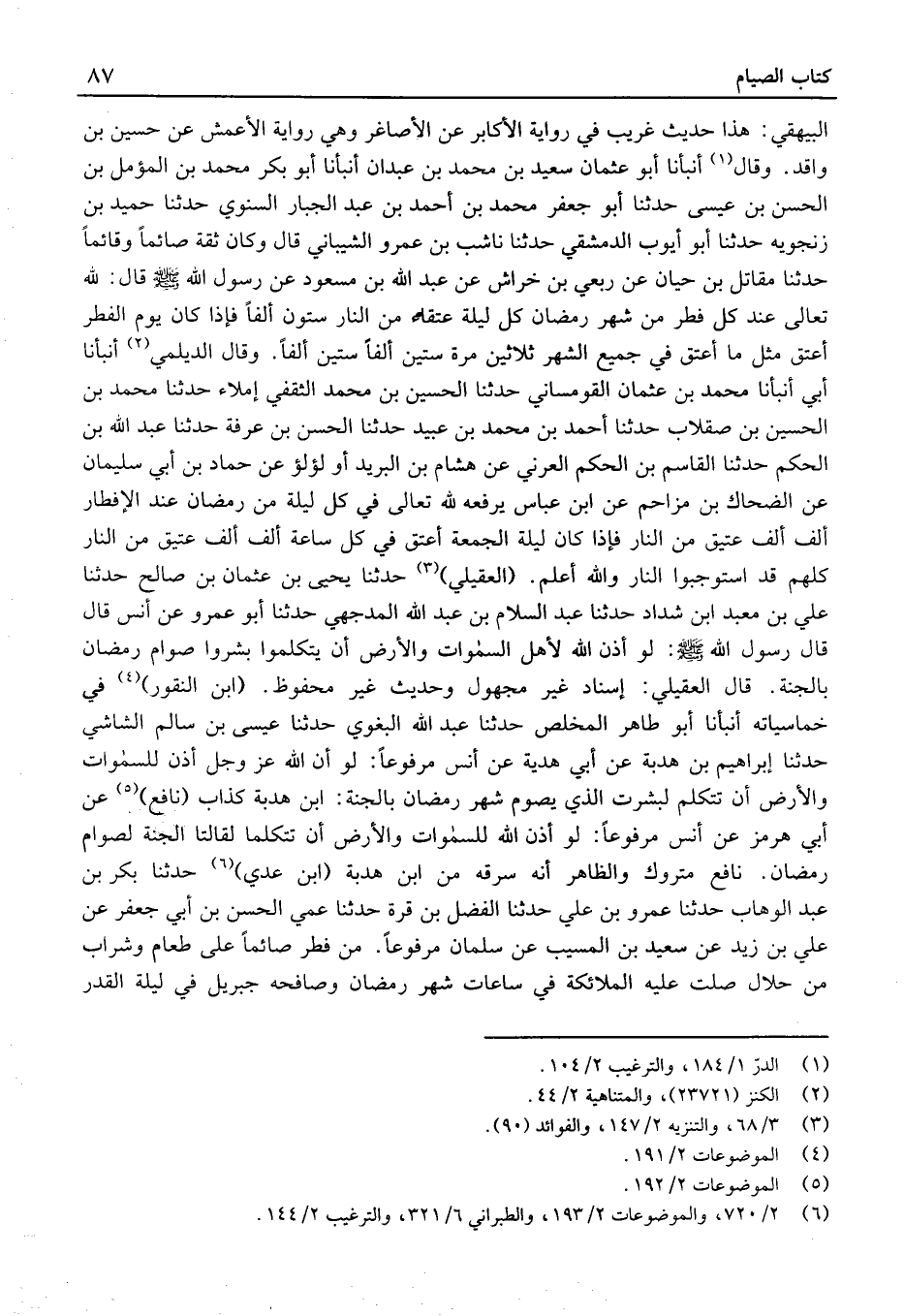 وقَالَ أَنْبَأَنَا أَبُو عُثْمَان سَعِيد بْن مُحَمَّد بْن عَبْدَانِ أَنْبَأنَا أَبُو بَكْر مُحَمَّد بْن المؤمل بْن الْحَسَن بْن عِيسَى حَدَّثَنَا أَبُو جَعْفَر مُحَمَّد بْن أَحْمَد بْن عَبْد الْجَبَّار السنوي حَدَّثَنَا حميد بْن زَنْجَويه حَدَّثَنَا أَبُو أَيُّوب الدِّمَشْقِي حَدَّثَنَا ناشب بْن عَمْرو الشَّيْبَانِيّ قَالَ وَكَانَ ثِقَة صَائِما وَقَائِمًا حَدَّثَنَا مقَاتل بْن حَيَّان عَنْ ربعي بْن خرَاش عَنْ عَبْدِ اللَّهِ بْنِ مَسْعُود عَن رَسُول الله: قَالَ لِلَّهِ تَعَالَى عِنْدَ كُلِّ فِطْرٍ مِنْ شَهْرِ رَمَضَانَ كُلَّ لَيْلَةٍ عُتَقَاءُ مِنَ النَّارِ سِتُّونَ أَلْفًا فَإِذَا كَانَ يَوْمُ الْفِطْرِ أَعْتَقَ مِثْلَ مَا أَعْتَقَ فِي جَمِيعِ الشَّهْرِ ثَلاثِينَ مَرَّةً سِتِّينَ أَلْفًا سِتِّينَ أَلْفًا.