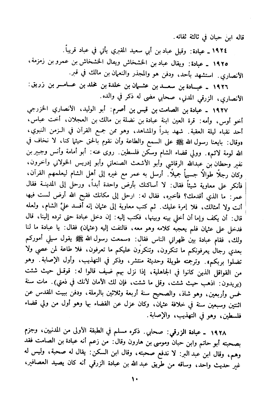 1928 - عبادة الزرقي صحابي ذكره مسلم في الطبقة الأولى من المدنيين وجزم بصحبته أبو حاتم وابن حبان وموسى بن هارون وقال: من زعم أنه عبادة بن الصامت فقد وهم وقال ابن عبد البر لا ندفع صحبته وقال ابن السكن يقال له صحبة وليس له غير حديث واحد وساقه من طريق عبد الله بن عبادة الزرقي أنه كان يصيد العصافير,