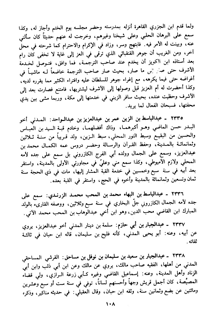 2336 - عبد الباسط بن البهاء محمد بن المحب محمد الزرندي: سمع على جده لأمه الجمال الكازروني جل البخاري في سنة سبع وثلاثين ووصفه القارئ بالولد المبارك ابن القاضي محب الدين وهو ابن أخي عبد الوهاب بن المحب محمد الآتي.