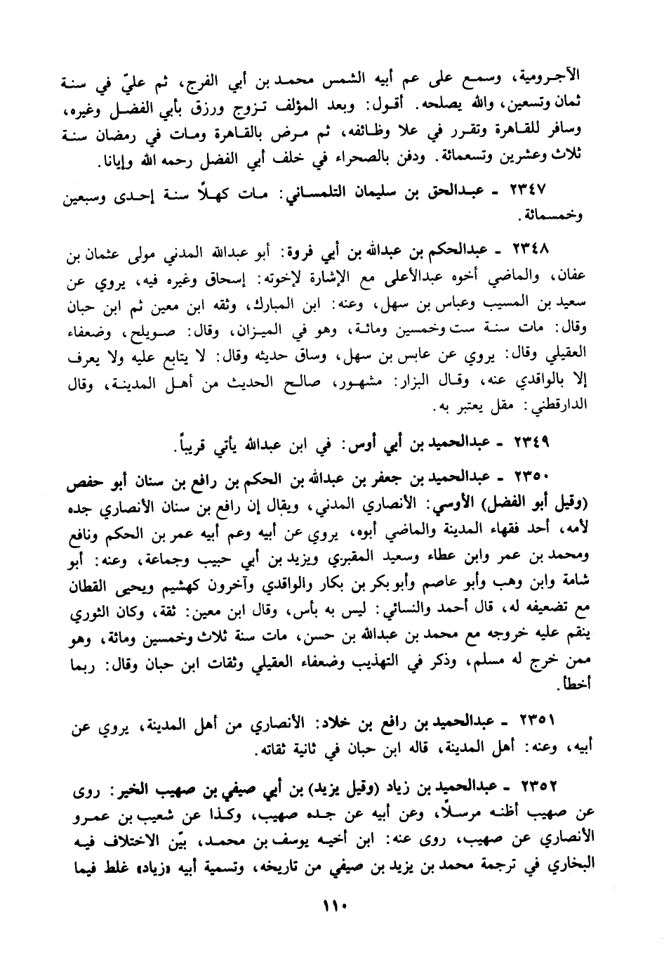 2351 - عبد الحميد بن رافع بن خلاد: الأنصاري من أهل المدينة يروي عن أبيه وعنه: أهل المدينة قاله ابن حبان في ثانية ثقاته.