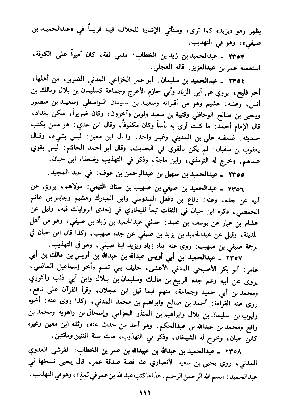 2358 - عبد الحميد بن عبد الله بن عبيد الله بن عمر بن الخطاب: القرشي العدوي المدني روى يحيى بن سعيد الأنصاري عنه قصة صدقة عمر, قال يحيى نسخها لي عبد الحميد "بسم الله الرحمن الرحيم هذا ما كتب عبد الله بن عمر في ثمغ" وهو في التهذيب.
