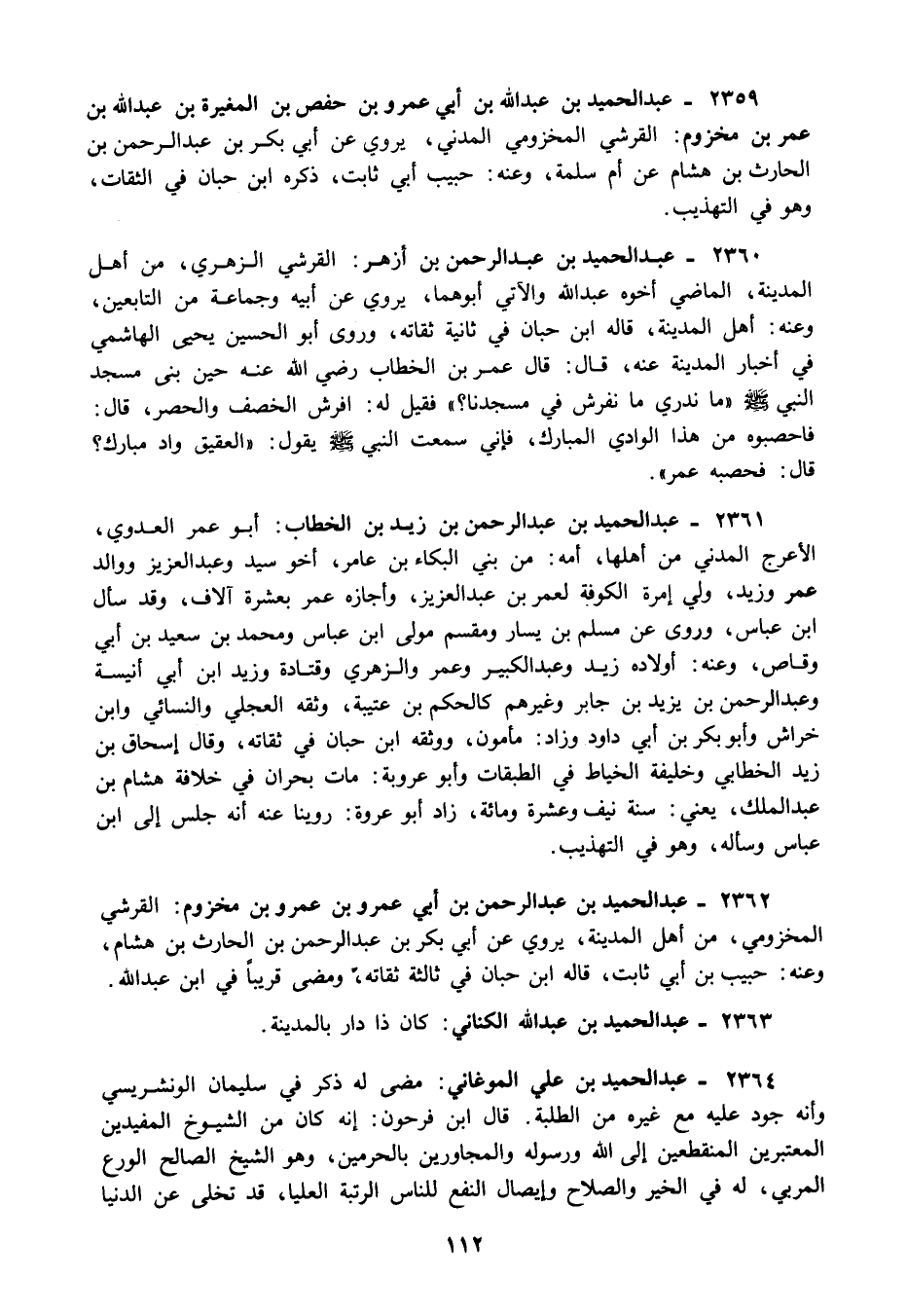 2360 - عبد الحميد بن عبد الرحمن بن أزهر: القرشي الزهري من أهل المدينة الماضي أخوه عبد الله والآتي أبوهما يروي عن أبيه وجماعة من التابعين وعنه: أهل المدينة قاله ابن حبان في ثانية ثقاته وروى أبو الحسين يحيى الهاشمي في أخبار المدينة عنه قال: قال عمر بن الخطاب رضي الله عنه حين بنى مسجد النبي صلى الله عليه وسلم "ما ندري ما نفرش في مسجدنا؟ " فقيل له: افرش الخصف والحصر قال: فاحصبوه من هذا الوادي المبارك فإني سمعت النبي صلى الله عليه وسلم يقول: "العقيق واد مبارك؟ قال: فحصبه عمر".
