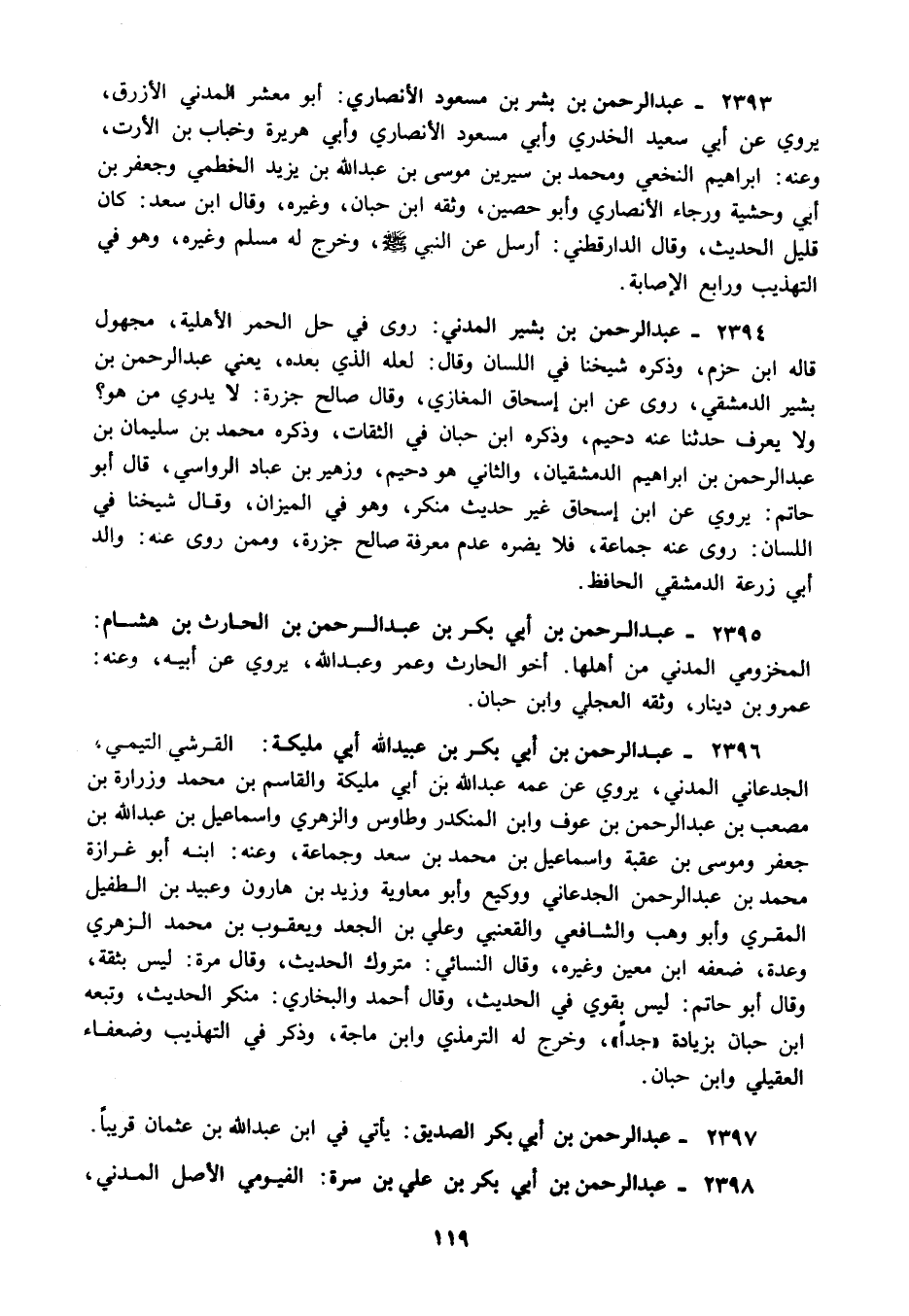 2395 - عبد الرحمن بن أبي بكر بن عبد الرحمن بن الحارث بن هشام: المخزومي المدني من أهلها أخو الحارث وعمر وعبد الله يروي عن أبيه وعنه: عمرو بن دينار وثقه العجلي وابن حبان.