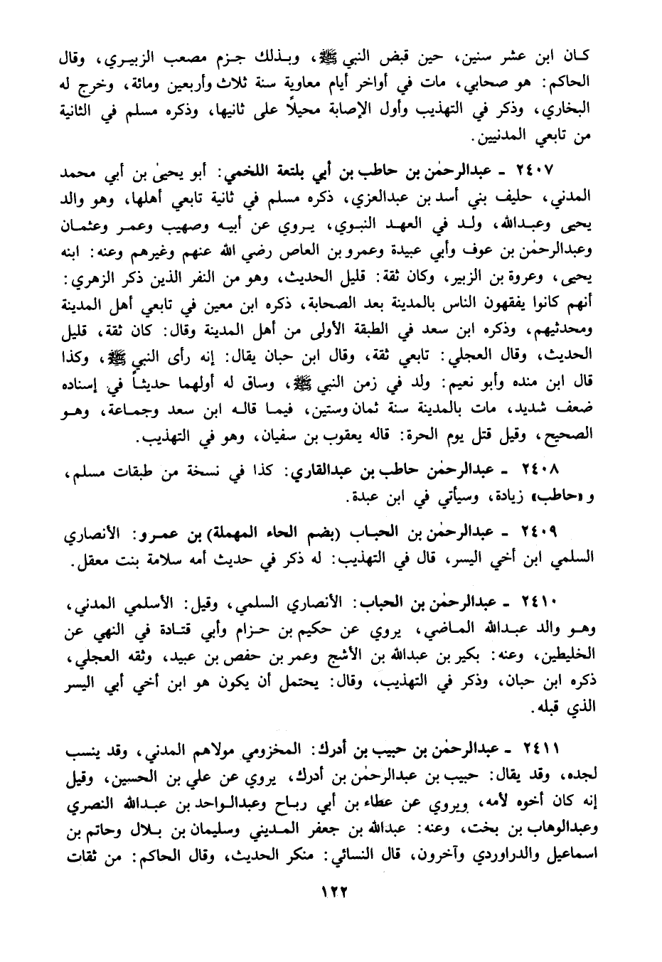 2409 – عبد الرحمن بن الحباب بضم الحاء المهملة بن عمرو: الأنصاري السلمي ابن أخي اليسر قال في التهذيب: له ذكر في حديث أمه سلامة بنت معقل.