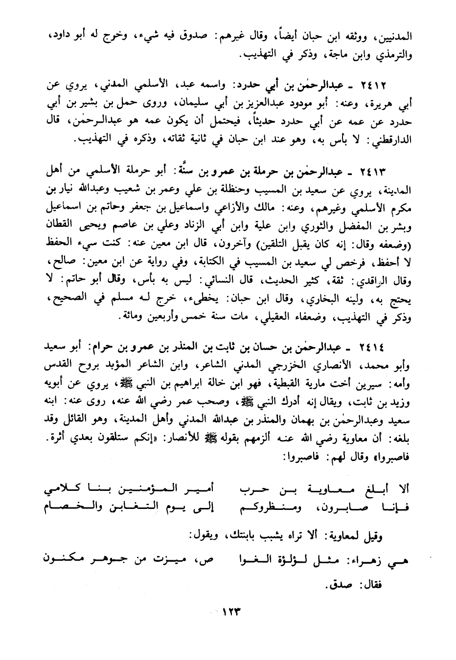 2414 - عبد الرحمن بن حسان بن ثابت بن المنذر بن عمرو بن حرام: أبو سعيد وأبو محمد الأنصاري الخزرجي المدني الشاعر وابن الشاعر المؤبد بروح القدس وأمه: سيرين أخت مارية القبطية فهو ابن خالة ابراهيم بن النبي صلى الله عليه وسلم يروي عن أبويه وزيد بن ثابت ويقال إنه أدرك النبي صلى الله عليه وسلم وصحب عمر رضي الله عنه روى عنه: ابنه سعيد وعبد الرحمن بن بهمان والمنذر بن عبد الله المدني وأهل المدينة وهو القائل وقد بلغه: أن معاوية رضي الله عنه ألزمهم بقوله صلى الله عليه وسلم للأنصار: "إنكم ستلقون بعدي أثرة فاصبروا" وقال لهم: فاصبروا: