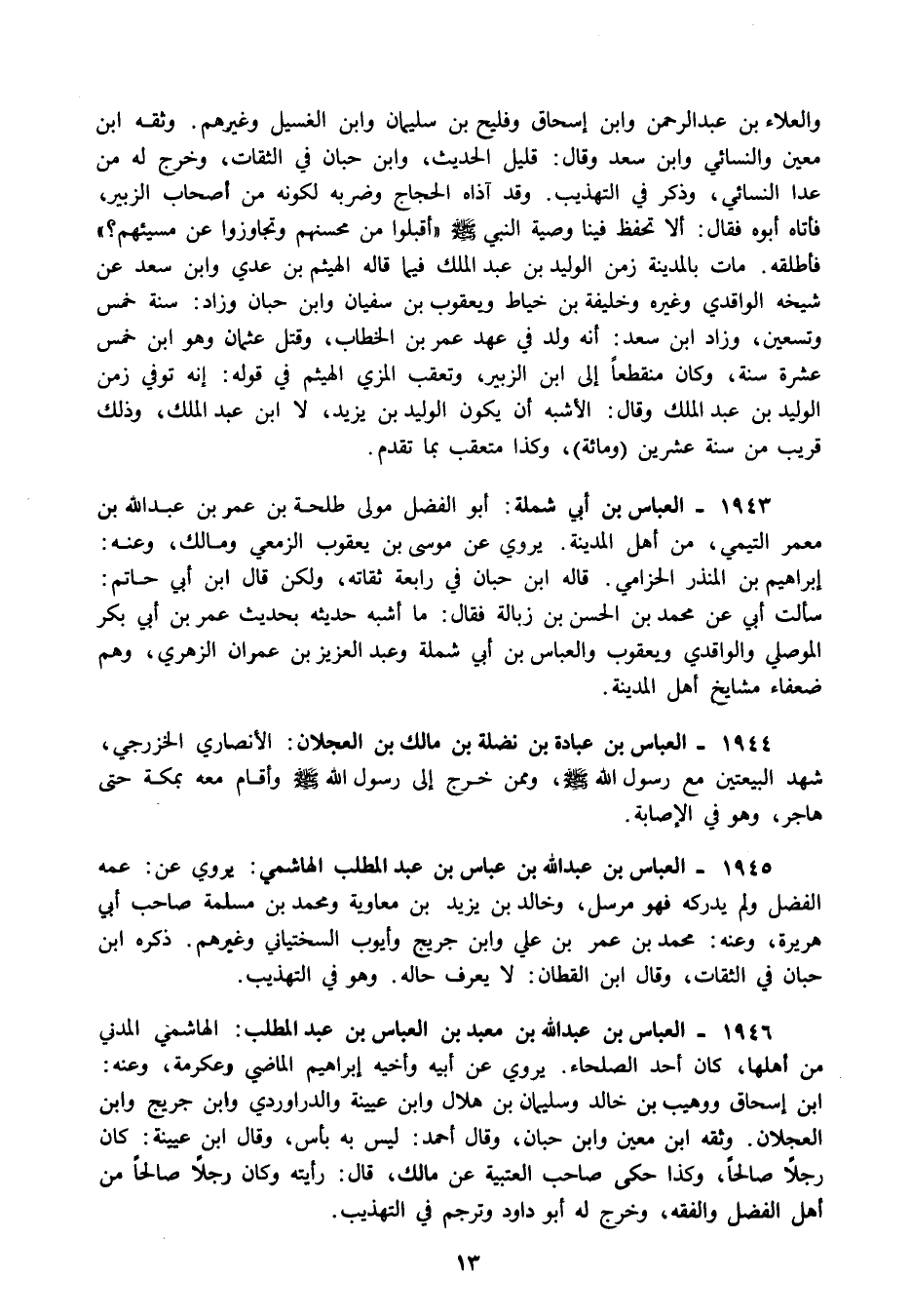 1945 - العباس بن عبد الله بن عباس بن عبد المطلب الهاشمي: يروي عن: عمه الفضل ولم يدركه فهو مرسل وخالد بن يزيد بن معاوية ومحمد بن مسلمة صاحب أبي هريرة وعنه محمد بن عمر بن علي وابن جريج وأيوب السختياني وغيرهم. ذكره ابن حبان في الثقات وقال ابن القطان: لا يعرف حاله وهو في التهذيب.