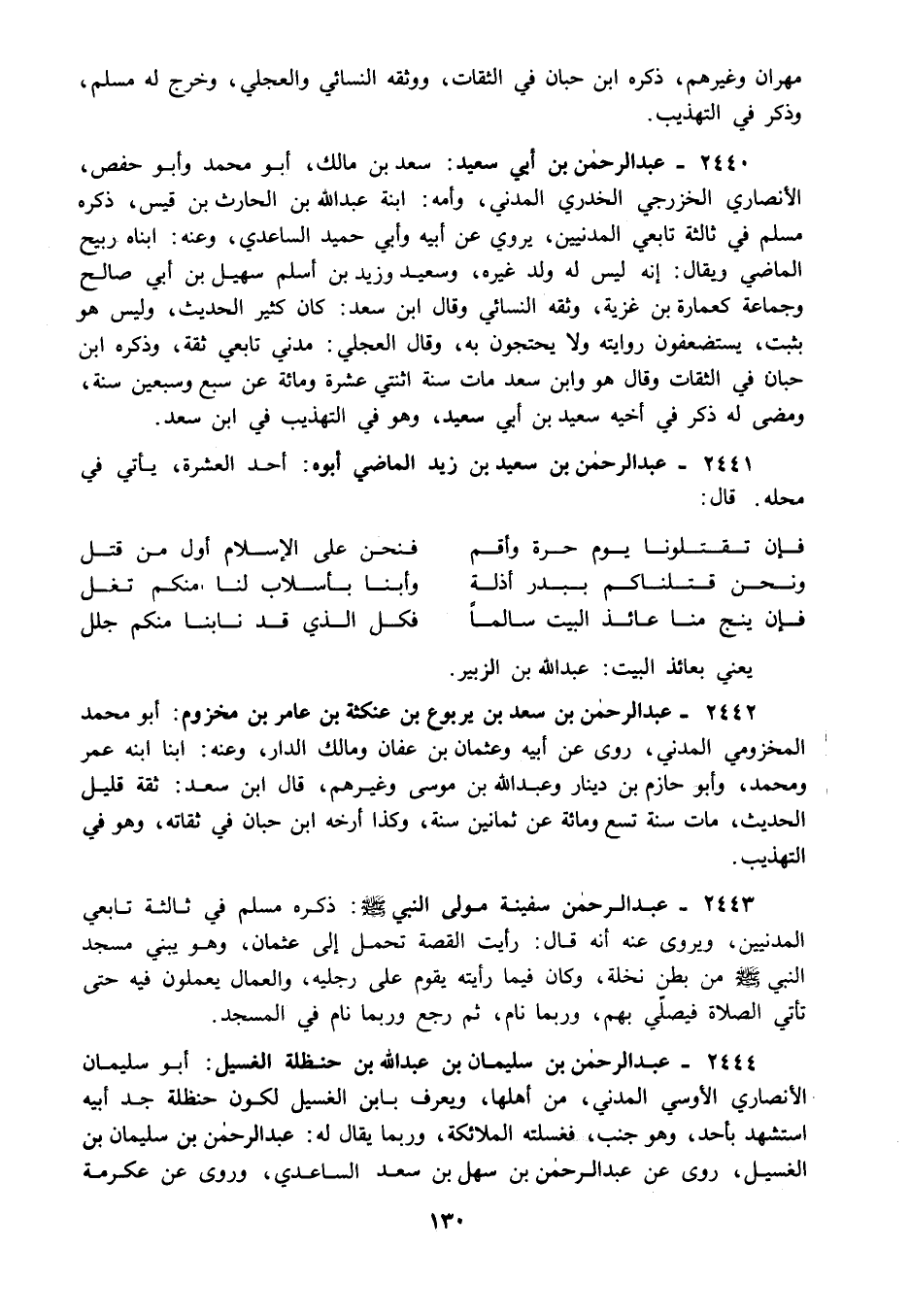 2444 - عبد الرحمن بن سليمان بن عبد الله بن حنظلة الغسيل: أبو سليمان الأنصاري الأوسي المدني من أهلها ويعرف بابن الغسيل لكون حنظلة جد أبيه استشهد بأحد وهو جنب فغسلته الملائكة وربما يقال له: عبد الرحمن بن سليمان بن الغسيل روى عن عبد الرحمن بن سهل بن سعد الساعدي وروى عن عكرمة