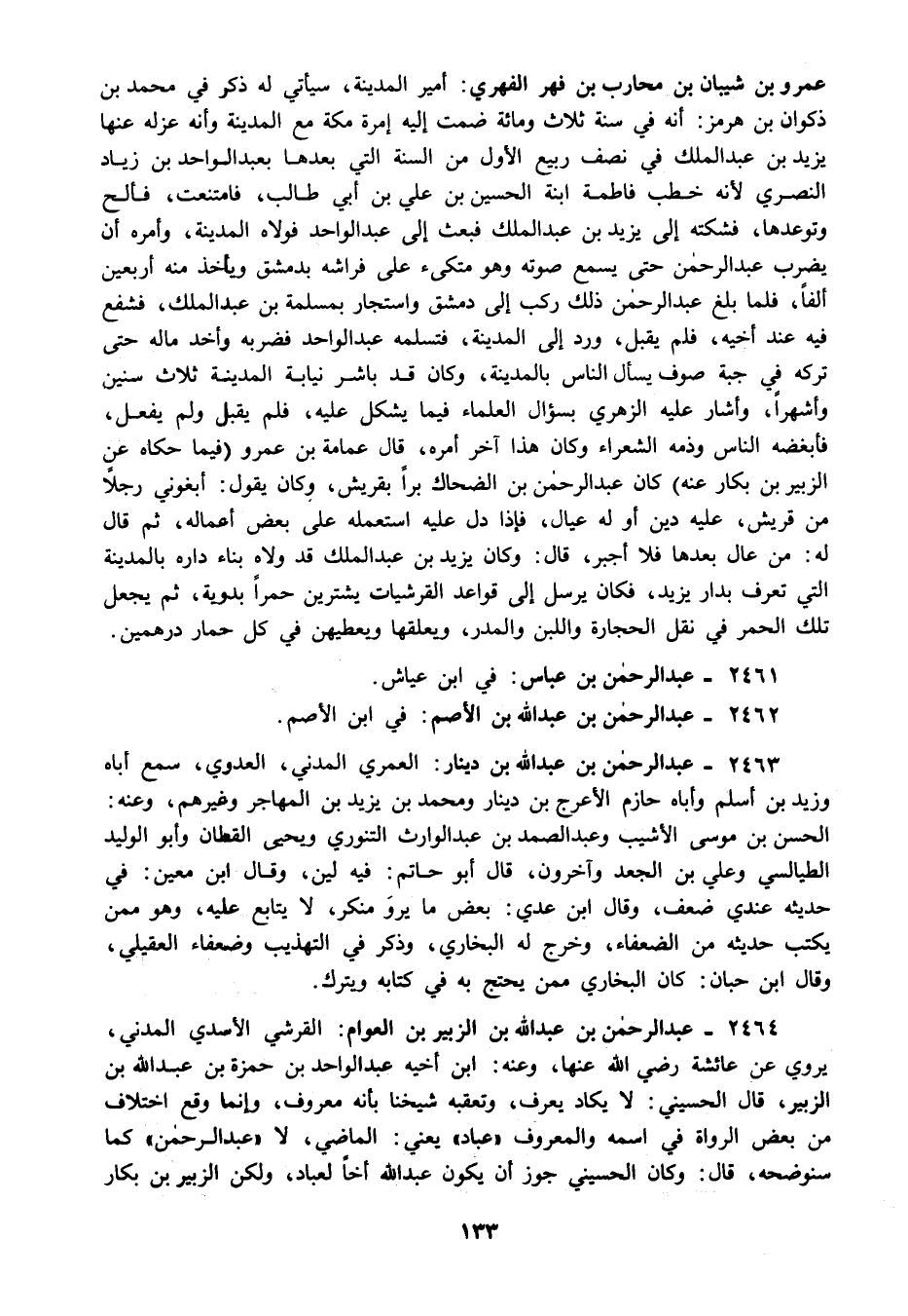 2464 - عبد الرحمن بن عبد الله بن الزبير بن العوام: القرشي الأسدي المدني يروي عن عائشة رضي الله عنها وعنه: ابن أخيه عبد الواحد بن حمزة بن عبد الله بن الزبير قال الحسيني: لا يكاد يعرف وتعقبه شيخنا بأنه معروف وإنما وقع اختلاف من بعض الرواة في اسمه والمعروف "عباد" يعني: الماضي لا "عبد الرحمن" كما سنوضحه قال: وكان الحسيني جوز أن يكون عبد الله أخا لعباد ولكن الزبير بن بكار