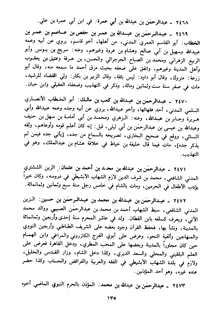 2471 - عبد الرحمن بن عبد الله بن محمد بن أحمد بن عثمان: الزين الششتري المدني الشافعي محمد بن شرف الدين لازم الشهاب الأبشيطي في دروسه وكان خيرا يؤدب الأطفال في الحرمين ومات بالشام في خامس رجل سنة سبع وثمانين وثمانمائة.