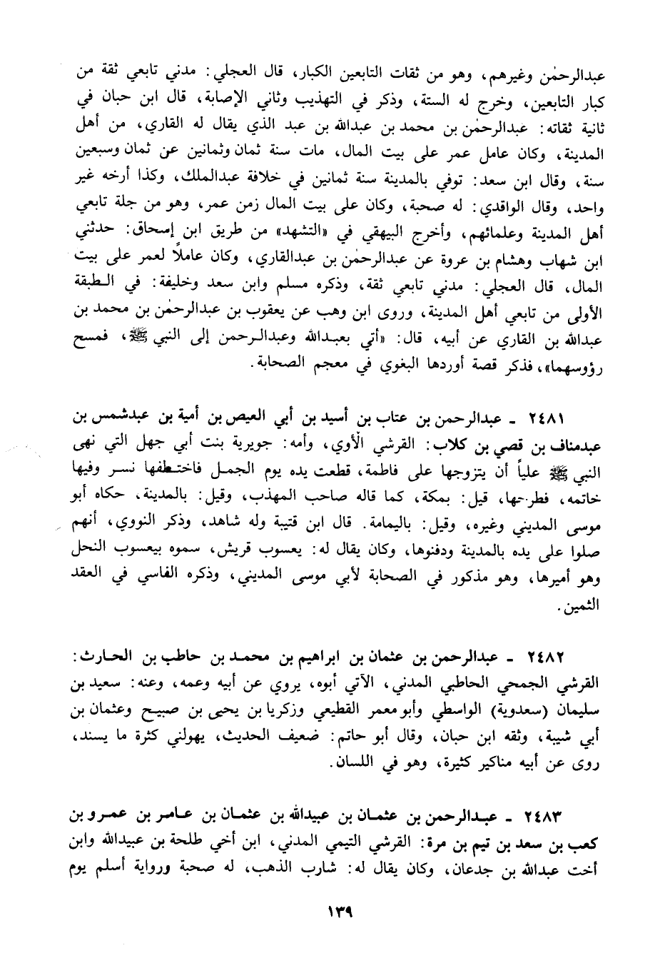 2483 – عبد الرحمن بن عثمان بن عبيد الله بن عثمان بن عامر بن عمرو بن كعب بن سعد بن تيم بن مرة: القرشي التيمي المدني ابن أخي طلحة بن عبيد الله وابن أخت عبد الله بن جدعان وكان يقال له: شارب الذهب له صحبة ورواية أسلم يوم