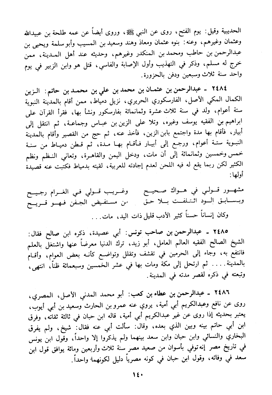 2484 - عبد الرحمن بن عثمان بن محمد بن علي بن محمد بن حاتم: الزين الكمال المكي الأصل الفارسكوري الحريري نزيل دمياط ممن أقام بالمدينة النبوية ستة أعوام ولد في سنة ثلاث عشرة وثمانمائة بفارسكور ونشأ بها فقرأ القرآن على إبراهيم بن الفقيه يوسف وغيره وتلا على الزين بن عباس وجماعة ثم انتقل إلى أبيار فأقام بها مدة واجتمع بابن الزين فأخذ عنه ثم حج من القصير وأقام بالمدينة النبوية ستة أعوام ورجع إلى أبيار فأقام بها مدة ثم قطن دمياط من سنة خمس وخمسين وثمانمائة إلى أن مات ودخل اليمن والقاهرة وتعاني النظم ونظم الكثير لكن ربما يقع له فيه اللحن لعدم إجادته للعربية لقيته بدمياط فكتبت عنه قصيدة أولها: