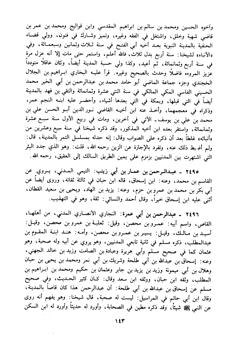 2495 - عبد الرحمن بن عمار بن أبي زينب: التيمي المدني يروي عن القاسم بن محمد وعنه: ابن إسحاق قاله ابن حبان في ثالثة ثقاته وروى ايضا عن أبي بكر بن محمد بن عمرو بن حزم وعنه يزيد بن الهاد ويحيى بن سعيد القطان أثنى عليه ابن إسحاق خيرا وقال أحمد والنسائي: ثقة وهو في التهذيب.