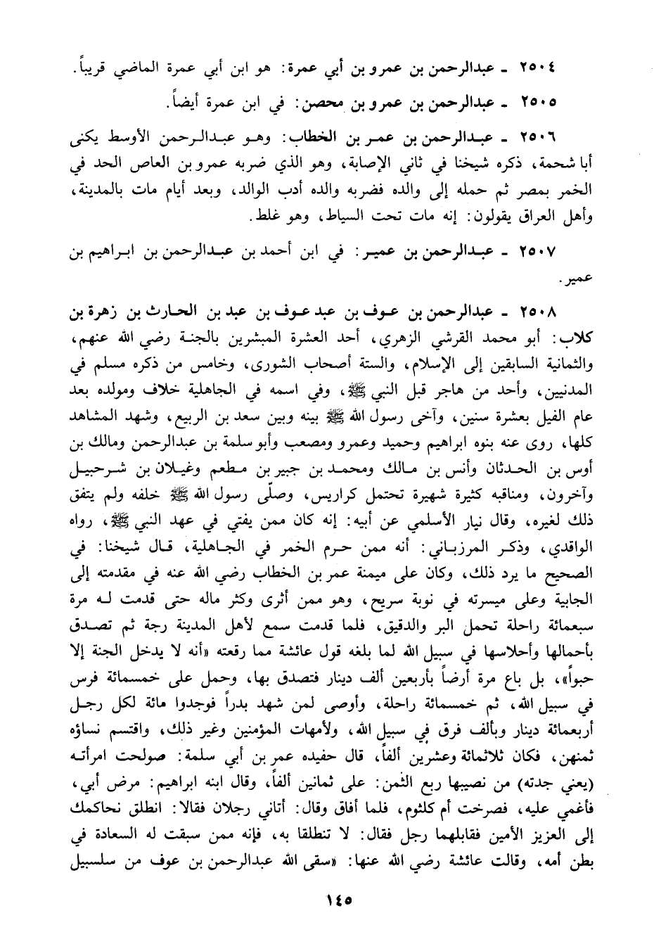 2508 - عبد الرحمن بن عوف بن عبد عوف بن عبد بن الحارث بن زهرة بن كلاب: أبو محمد القرشي الزهري أحد العشرة المبشرين بالجنة رضي الله عنهم والثمانية السابقين إلى الإسلام والستة أصحاب الشورى وخامس من ذكره مسلم في المدنيين وأحد من هاجر قبل النبي صلى الله عليه وسلم وفي اسمه في الجاهلية خلاف ومولده بعد عام الفيل بعشرة سنين وآخى رسول الله صلى الله عليه وسلم بينه وبين سعد بن الربيع وشهد المشاهد كلها روى عنه بنوه ابراهيم وحميد وعمرو ومصعب وأبو سلمة بن عبد الرحمن ومالك بن أوس بن الحدثان وأنس بن مالك ومحمد بن جبير بن مطعم وغيلان بن شرحبيل وآخرون ومناقبه كثيرة شهيرة تحتمل كراريس وصلى رسول الله صلى الله عليه وسلم خلفه ولم يتفق ذلك لغيره وقال نيار الأسلمي عن أبيه: إنه كان ممن يفتي في عهد النبي صلى الله عليه وسلم رواه الواقدي وذكر المرزباني أنه ممن حرم الخمر في الجالهية قال شيخنا: في الصحيح ما يرد ذلك وكان على ميمنة عمر بن الخطاب رضي الله عنه في مقدمته إلى الجابية وعلى ميسرته في نوبة سريح وهو ممن أثرى وكثر ماله حتى قدمت له مرة سبعمائة راحلة تحمل البر والدقيق فلما قدمت سمع لأهل المدينة رجة ثم تصدق بأحمالها وأحلاسها في سبيل الله لما بلغه قول عائشة مما رقعته "أنه لا يدخل الجنة إلا حبوا" بل باع مرة أرضا بأربعين ألف دينار فتصدق بها وحمل على خمسمائة فرس في سبيل الله ثم خمسمائة راحلة وأوصى لمن شهد بدرا فوجدوا مائة لكل رجل أربعمائة دينار وبألف فرق في سبيل الله ولأمهات المؤمنين وغير ذلك واقتسم نساؤه ثمنهن فكان ثلاثمائة وعشرين ألفا قال حفيده عمر بن أبي سلمة: صولحت امرأته "يعني جدته" من نصيبها ربع الثمن: على ثمانين ألفا وقال ابنه ابراهيم: مرض أبي فأغمي عليه فصرخت أم كلثوم فلما أفاق وقال: أتاني رجلان فقالا: انطلق نحاكمك إلى العزيز الأمين فقابلهما رجل فقال: لا تنطلقا به فإنه ممن سبقت له السعادة في بطن أمه وقالت عائشة رضي الله عنها: "سقى الله عبد الرحمن بن عوف من سلسبيل