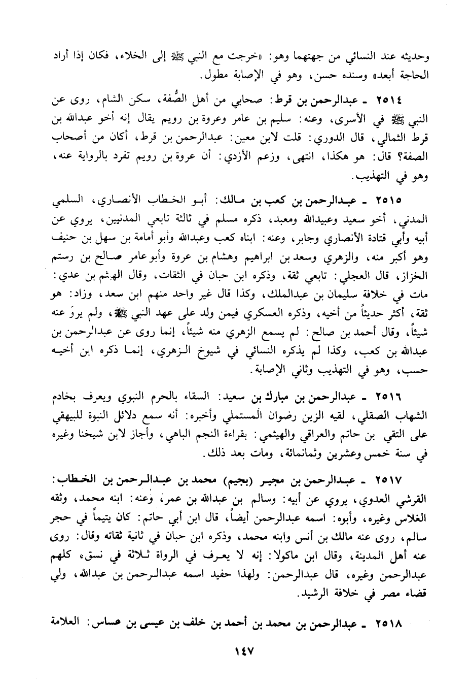 2515 - عبد الرحمن بن كعب بن مالك: أبو الخطاب الأنصاري السلمي المدني أخو سعيد وعبيد الله ومعبد ذكره مسلم في ثالثة تابعي المدنيين يروي عن أبيه وأبي قتادة الأنصاري وجابر وعنه: ابناه كعب وعبد الله وأبو أمامة بن سهل بن حنيف وهو أكبر منه والزهري وسعد بن ابراهيم وهشام بن عروة وأبو عامر صالح بن رستم الخزاز قال العجلي: تابعي ثقة وذكره ابن حبان في الثقات وقال الهيثم بن عدي: مات في خلافة سليمان بن عبد الملك وكذا قال غير واحد منهم ابن سعد وزاد: هو ثقة أكثر حديثا من أخيه وذكره العسكري فيمن ولد على عهد النبي صلى الله عليه وسلم ولم يرو عنه شيئا وقال احمد بن صالح: لم يسمع الزهري منه شيئا إنما روى عن عبد الرحمن بن عبد الله بن كعب وكذا لم يذكره النسائي في شيوخ الزهري, إنما ذكره ابن أخيه حسب وهو في التهذيب وثاني الإصابة.