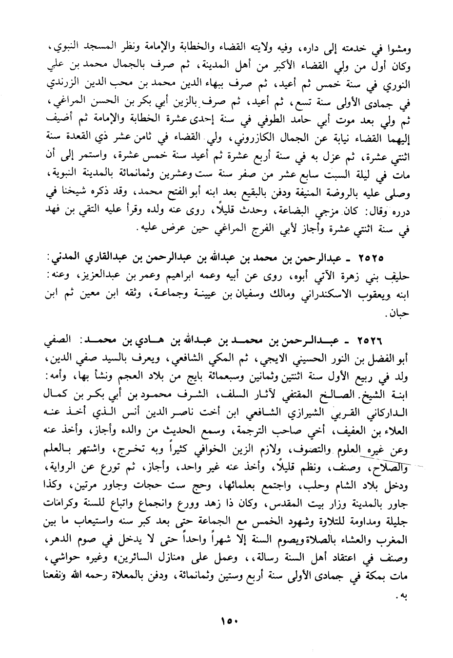 2526 - عبد الرحمن بن محمد بن عبد الله بن هادي بن محمد: الصفي أبو الفضل بن النور الحسيني الآيجي ثم المكي الشافعي ويعرف بالسيد صفي الدين ولد في ربيع الأول سنة اثنتين وثمانين وسبعمائة بأيج من بلاد العجم ونشأ بها وأمه: ابنة الشيخ الصالح المقتفي لآثار السلف الشرف محمود بن أبي بكر بن كمال الداركاني القربي الشيرازي الشافعي ابن أخت ناصر الدين أنس الذي أخذ عنه العلاء بن العفيف أخي صاحب الترجمة وسمع الحديث من والده وأجاز وأخذ عنه وعن غيره العلوم والتصوف ولازم الزين الخوافي كثيرا وبه تخرج واشتهر بالعلم والصلاح وصنف ونظم قليلا واخذ عنه غير واحد وأجاز ثم تورع عن الرواية ودخل بلاد الشام وحلب واجتمع بعلمائها وحج ست حجات وجاور مرتين وكذا جاور بالمدينة وزار بيت المقدس وكان ذا زهد وورع وانجماع واتباع للسنة وكرامات جليلة ومداومة للتلاوة وشهود الخمس مع الجماعة حتى بعد كبر سنة واستيعاب ما بين المغرب والعشاء بالصلاة ويصوم السنة إلا شهرا واحدا حتى لا يدخل في صوم الدهر وصنف في اعتقاد أهل السنة رسالة وعمل على "منازل السائرين" وغيره حواشي مات بمكة في جمادى الأولى سنة اربع وستين وثمانمائة ودفن بالمعلاة رحمه الله ونفعنا به.
