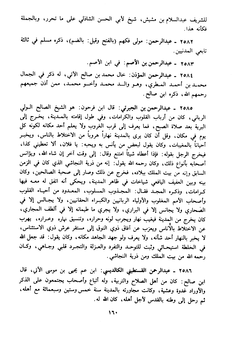 2585 - عبد الرحمن بن الجبرتي: قال ابن فرحون: هو الشيخ الصالح الولي الرباني كان من أرباب القلوب والكرامات وفي طول إقامته بالمدينة يخرج إلى البرية بعد صلاة الصبح فما يعرف إلى قرب الغروب ولا يعلم أحد مكانه لكونه كل يوم في مكان وقل أن كان يرى بالمدينة نهارا هروبا من الاختلاط بالناس ويخبر أحيانا بالمغيبات وكان يقول لبعض من يأنس به ويحبه: يا فلان ألا تعطيني كذا فيخرج الرجل بقوله: فإذا أعطاه شيئا امتنع وقال: إلى وقت آخر إن شاء الله ويؤانس أصحابه بأنواع ذلك وكان رحمه الله يقول: إنه من ذرية النجاشي الذي كان في الزمن السابق وإنه من بيت الملك ببلاده فخرج عن ذلك وصار إلى صحبة الصالحين وكان بينه وبين العفيف اليافعي شياخات في ظاهر المدينة ويحكى أنه اتفق له معه فيها كرامات وذكره المجد فقال: المجذوب المسلوب المعدود من أحياء القلوب وأصحاب الأمم المغلوب والأولياء الربانيين والكبراء الحقانيين ولا يجالس إلا في الصحاري ولا يجانس إلا في البراري ولا يجري ما طيمانه إلا في ألطف المجاري كان يخرج من المدينة فيغيب نهار ويجرب لونه وحراره وتنسيق نهاره وعراره يهرب عن الاختلاط بالأناس ويعزب عن آفاق ذوي النوق إلى مستقر عرش ذوي الاستئناس لا يخبر بالنهار أحد شأنه ولا يعرف ولو جهد الجاهد مكانه وكان يقول: قد جعل الله في الخلطة استيحائي وثبت للتوحد والتفرد والعزلة والتجرد قلبي وجاهي وكان رحمه الله من بيت الملك ومن ذرية النجاشي.