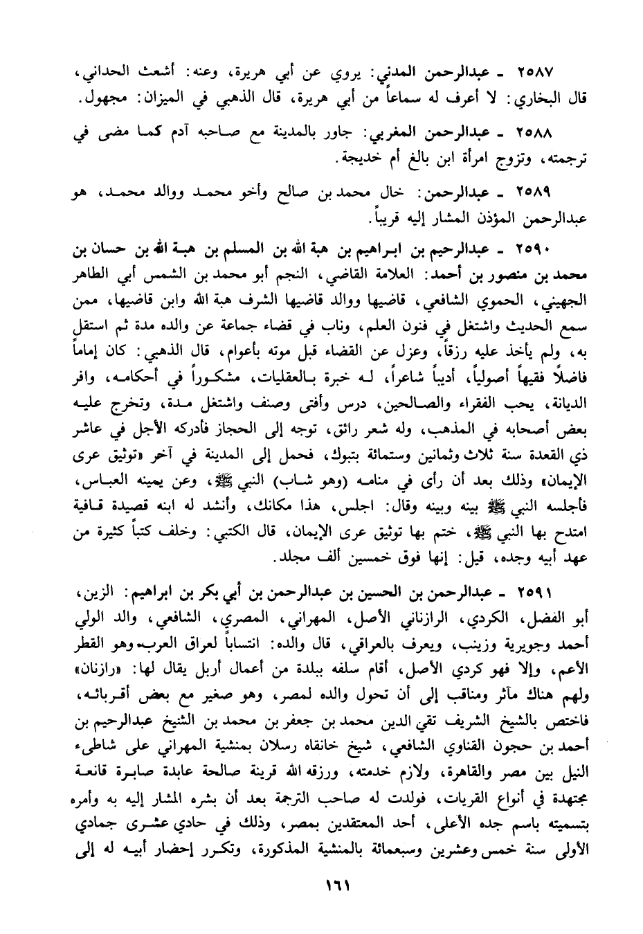 2591 - عبد الرحمن بن الحسين بن عبد الرحمن بن أبي بكر بن ابراهيم: الزين أبو الفضل الكردي الرازناني الأصل المهراني المصري الشافعي والد الولي أحمد وجويرية وزينب ويعرف بالعراقي قال والده: انتسابا لعراق العرب وهو القطر الأعم وإلا فهو كردي الأصل أقام سلفه ببلدة من أعمال أربل يقال لها "رازنان" ولهم هناك مآثر ومناقب إلى أن تحول والده لمصر وهو صغير مع بعض أقربائه فاختص بالشيخ الشريف تقي الدين محمد بن جعفر بن محمد بن الشيخ عبد الرحيم بن أحمد بن حجون القناوي الشافعي شيخ خانقاه رسلان بمنشية المهراني على شاطىء النيل بين مصر والقاهرة ولازم خدمته ورزقه الله قرينة صالحة عابدة صابرة قانعة مجتهدة في أنواع القريات فولدت له صاحب الترجمة بعد أن بشره المشار إليه به وأمره بتسميته باسم جده الأعلى أحد المعتقدين بمصر وذلك في حادي عشرى جمادي الأولى سنة خمس وعشرين وسبعمائة بالمنشية المذكورة وتكرر إحضار أبيه له إلى