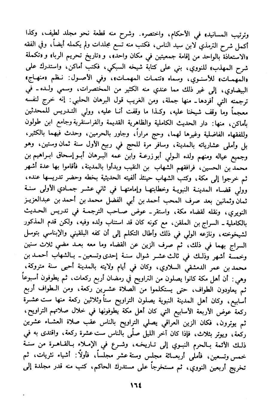وترتيب المسانيد" في الأحكام واختصره وشرح منه قطعة نحو مجلد لطيف وكذا أكمل شرح الترمذي لابن سيد الناس فكتب منه تسع مجلدات ولم يكمله أيضا وفي الفقه "الاستعاذة بالواحد من إقامة جمعيتين في مكان واحد" و "تاريخ تحريم الربا" و"تكملة شرح المهذب" للنووي بني على كتابة شيخه السبكي فكتب أماكن وأستدرك على "المهمات" للأسنوي وسماه "تتمات المهمات" وفي الأصول: نظم "منهاج" البيضاوي إلى غير ذلك مما عندي منه الكثير من المختصرات وسمي ولده - في ترجمته التي أفردها - منها جملة ومن الغريب قول البرهان الحلبي: إنه خرج لنفسه معجما وما وقف شيخنا عليه وكذا ما وقفت أنا عليه وولي التدريس للمحدثين بأماكن منها: دار الحديث الكاملية والظاهرية القديمة والقراسنقرية وجامع ابن طولون وللفقهاء الفاضلية وغيرها لهما وحج مرارا وجاور بالحرمين وحدث فيهما بالكثير بل وأملى عشارياته بالمدينة وسافر مرة للحج في ربيع الأول سنة ثمان وستين وهو وجميع عياله ومنهم ولده الولي أبوزرعة وابن عمه البرهان أبو إسحاق ابراهيم بن محمد بن الحسين فرافقهم الشهاب بن النقيب وبدأوا بالمدينة فأقاموا بها عدة أشهر ثم خرجوا إلى مكة وكتب الشهاب حينئذ ألفيته الحديثية بخطه وحضر تدريسها عنده وولي قضاء المدينة النبوية وخطابتها وإمامتها في ثاني عشر جمادي الأولى سنة ثمان وثمانين بعد صرف المحب أحمد بن أبي الفضل محمد بن أحمد بن عبد العزيز النويري ونقله لقضاء مكة واستقر - عوض صاحب الترجمة في تدريس الحديث بالكاملية - السراج بن الملقن مع كونه كان قد استناب ولده وفيه ولكن قدم المذكور لشيخوخته ونازعه الولي في ذلك وأطال التكلم إلى أن كفه البلقيني والإبناسي بتوسل السراج بهما في ذلك ثم صرف الزين عن القضاء وما معه بعد مضي ثلاث سنين وخمسة أشهر وذلك في ثالث عشر شوال سنة إحدى وتسعين - بالشهاب أحمد بن محمد بن عمر الدمشقي السلاوي وكان في أيام ولايته بالمدينة أحيى سنة متروكة وهي: أن أهل مكة كانوا يصلون من التراويح في رمضان أربع ركعات ثم يطوفون أسبوعا ثم يعاودون الطواف حتى يستكلموا من الصلاة عشرين ركعة ومن الطواف أربع أسابيع وكان أهل المدينة النبوية يصلون التراويح ستا وثلاثين ركعة منها ست عشرة ركعة عوض الأربعة الأسابيع التي كان أهل مكة يطوفونها في خلال صلاتهم التراويح ثم يوترون فكان الزين العراقي يصلي التراويح بالناس عقب صلاة العشاء عشرين ركعة ويوتر بثلاث فإذا كان آخر الليل صلى بالناس ست عشرة ركعة واقتدى به في ذلك الأئمة بالحرم النبوي إلى تاريخه وشرع في الإملاء بالقاهرة من سنة خمسين وتسعين فأملى أربعمائة مجلس وستة عشر مجلسا فأولا: أشياء نثريات ثم تخريج أربعين النووي ثم مستخرجا على مستدرك الحاكم كتب منه قدر مجلدة إلى