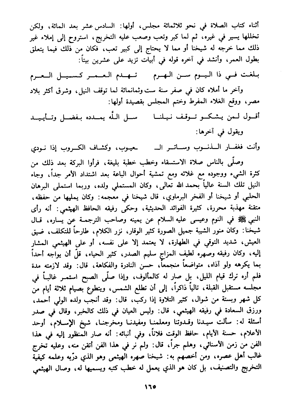 وصلى بالناس صلاة الاستسقاء وخطب خطبة بليغة فرأوا البركة بعد ذلك من كثرة الشيء ووجوده مع غلائه ومع تمشية أحوال الباعة بعد اشتداد الأمر جدا وجاء النيل تلك السنة عاليا بحمد الله تعالى وكان المستملي ولده وربما استملى البرهان الحلبي أو شيخنا أو الفخر البرماوي قال شيخنا في معجمه: وكان يمليها من حفظه متقنة مهذبة محررة كثيرة الفوائد الحديثية وحكى رفيقه الحافظ الهيثمي: أنه رأى النبي صلى الله عليه وسلم في النوم وعيسى عليه السلام عن يمينه وصاحب الترجمة عن يساره قال شيخنا: وكان منور الشيبة جميل الصورة كثير الوقار نزر الكلام طارحا للتكلف ضيق العيش شديد التوقي في الطهارة لا يعتمد إلا على نفسه أو على الهيثمي المشار إليه وكان رفيقه وصهره لطيف المزاج سليم الصدر كثير الحياء قل أن يواجه أحدا بما يكرهه ولو آذاه متواضعا منجمعا حسن النادرة والفكاهة قال: وقد لازمته مدة فلم أره ترك قيام الليل بل صار له كالمألوف وإذا صلى الصبح استمر غالبا في مجلسه مستقبل القبلة تاليا ذاكرا إلى أن تطلع الشمس ويتطوع بصيام ثلاثة أيام من كل شهر وبستة من شوال كثير التلاوة إذا ركب قال: وقد أنجب ولده الولي أحمد ورزق السعادة في رفيقه الهيثمي قال: وليس العيان في ذلك كالخبر وقال في صدر أسئلة له: سألت سيدنا وقدوتنا ومعلمنا ومفيدنا ومخرجنا شيخ الإسلام أوحد الأعلام حسنة الأيام حافظ الوقت فلانا وفي أنبائه: أنه صار المنظور إليه في هذا الفن من زمن الأسنائي وهلم جرا قال: ولم نر في هذا الفن أتقن منه وعليه تخرج غالب أهل عصره ومن أخصهم به: شيخنا صهره الهيثمي وهو الذي دربه وعلمه كيفية التخريج والتصنيف بل كان هو الذي يعمل له خطب كتبه ويسميها له وصال الهيثمي