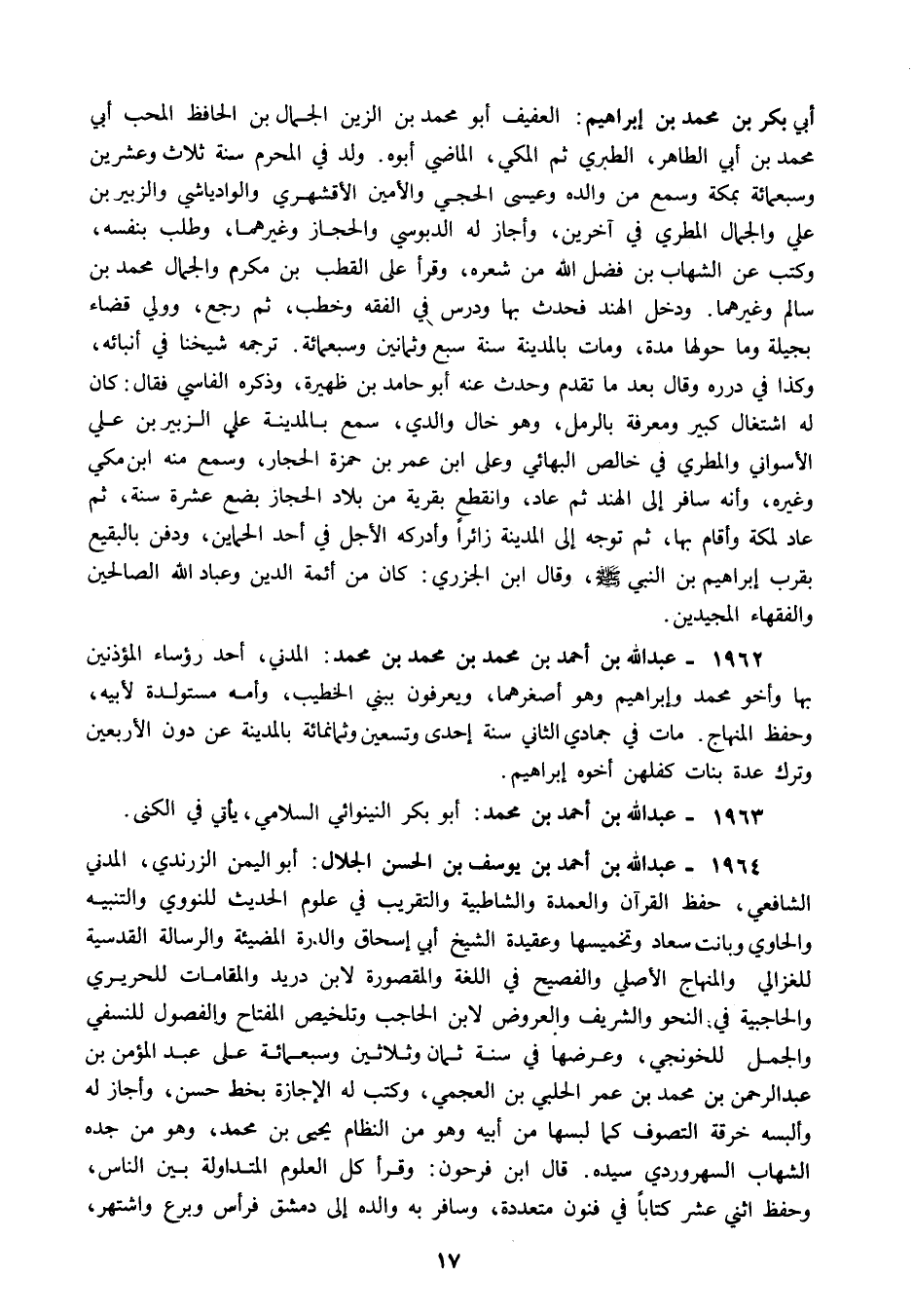 1964 - عبد الله بن أحمد بن يوسف بن الحسن الجلال: أبو اليمن الزرندي المدني الشافعي حفظ القرآن والعمدة والشاطبية والتقريب في علوم الحديث للنووي والتنبيه والحاوي وبانت سعاد وتخميسها وعقيدة الشيخ أبي إسحاق والدرة المضيئة والرسالة القدسية للغزالي والمنهاج الأصلي والفصيح في اللغة والمقصورة لابن دريد والمقامات للحريري والحاجبية في النحو والشريف والعروض لابن الحاجب وتلخيص المفتاح والفصول للنسفي والجمل للخونجي وعرضها في سنة ثمان وثلاثين وسبعمائة على عبد المؤمن بن عبد الرحمن بن محمد بن عمر الحلبي بن العجمي, وكتب له الإجازة بخط حسن وأجاز له وألبسه خرقة التصوف كما لبسها من أبيه وهو من النظام يحيى بن محمد وهو من جده الشهاب السهروردي سيده قال ابن فرحون: وقرأ كل العلوم المتداولة بين الناس وحفظ اثني عشر كتابا في فنون متعددة وسافر به والده إلى دمشق فرأس وبرع واشتهر,