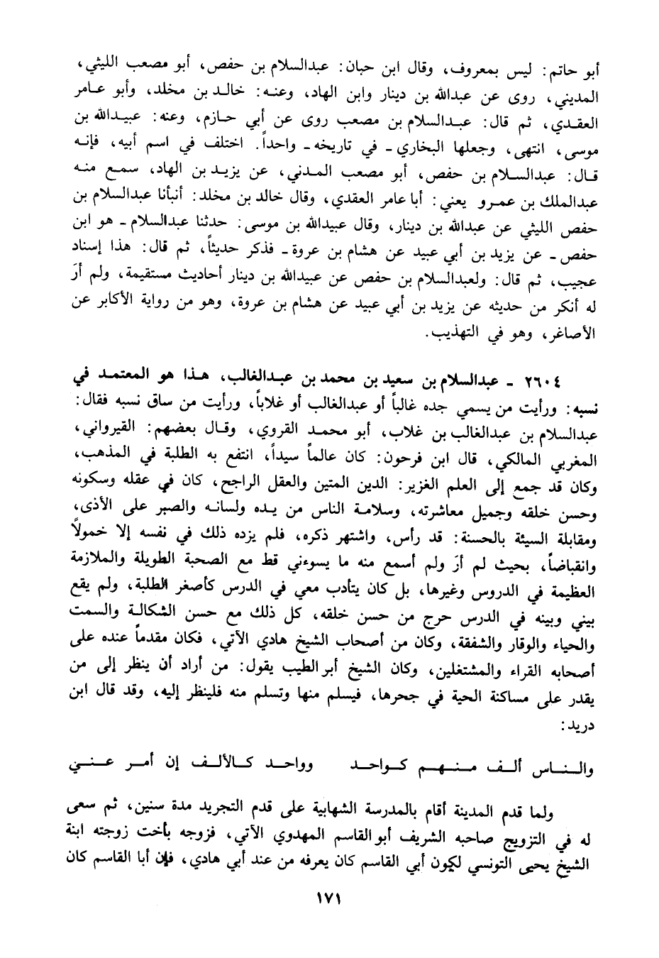 2604 - عبد السلام بن سعيد بن محمد بن عبد الغالب هذا هو المعتمد في نسبه: ورأيت من يسمي جده غالبا أو عبد الغالب أو غلابا ورأيت من ساق نسبه فقال: عبد السلام بن عبد الغالب غلاب أبو محمد القروي وقال بعضهم: القيرواني المغربي المالكي قال ابن فرحون: كان عالما سيدا انتفع به الطلبة في المذهب وكان قد جمع إلى العلم الغزير: الدين المتين والعقل الراجح كان في عقله وسكونه وحسن خلقه وجميل معاشرته وسلامة الناس من يده ولسانه والصبر على الأذى ومقابلة السيئة بالحسنة: قد رأس واشتهر ذكره فلم يزده ذلك في نفسه إلا خمولا وانقباضا بحي لم أر ولم أسمع منه ما يسوءني قط مع الصحبة الطويلة والملازمة العظيمة في الدروس وغيرها بل كان يتأدب معي في الدرس كأصغر الطلبة ولم يقع بيني وبينه في الدرس حرج من حسن خلقه كل ذلك مع حسن الشكالة والسمت والحياء والوقار والشفقة وكان من أصحاب الشيخ هادي الآتي فكان مقدما عنده على أصحابه القراء والمشتغلين وكان الشيخ أبو الطيب يقول: من أراد أن ينظر إلى من يقدر على مساكنه الحية في جحرها فيسلم منها وتسلم منه فلينظر إليه وقد قال ابن دريد: