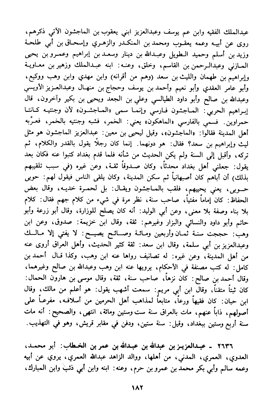 2636 - عبد العزيز بن عبد الله بن عبد الله بن عمر بن الخطاب: أبو محمد العدوي العمري المدني من أهلها ووالد الزاهد عبد الله العمري يروي عن أبيه وعمه سالم وأبي بكر محمد بن عمرو بن حرم وعنه: ابنه وابن أبي ذئب وابن المبارك,