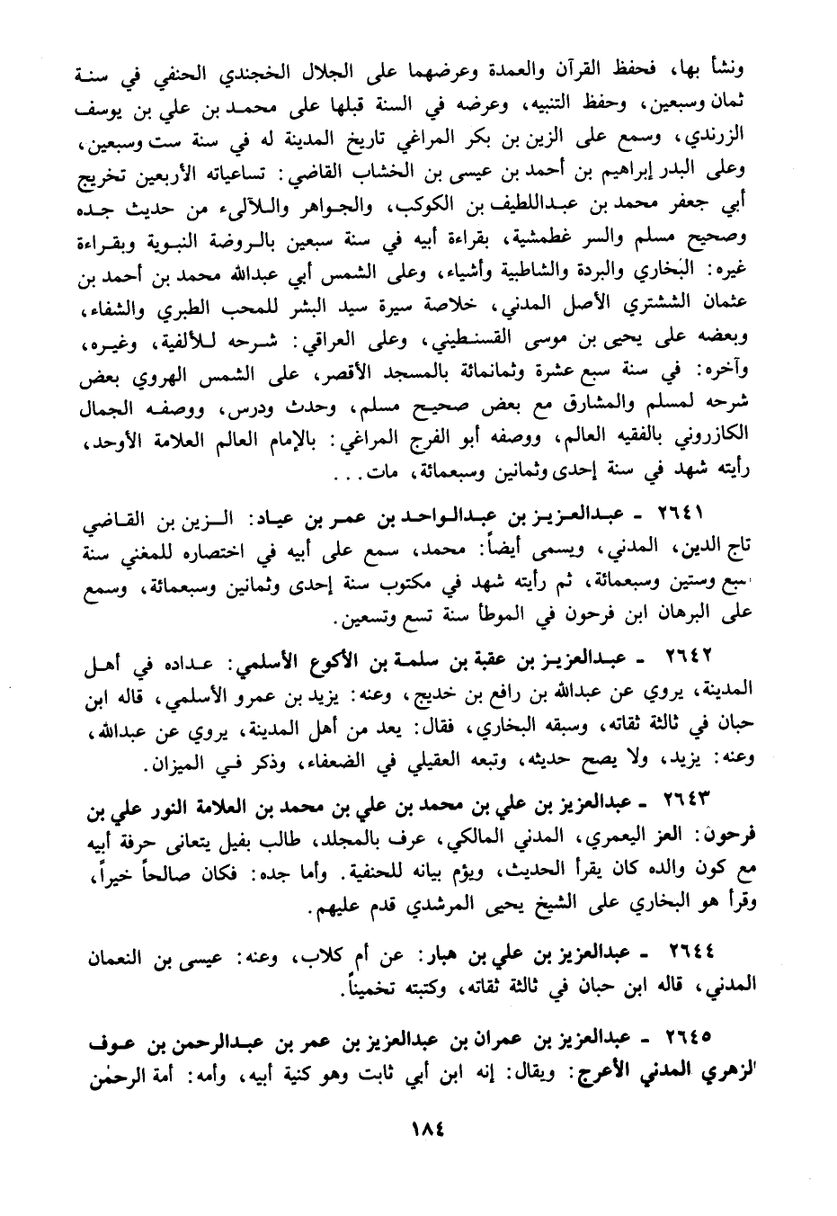2641 - عبد العزيز بن عبد الواحد بن عمر بن عياد: الزين بن القاضي تاج الدين المدني ويسمى أيضا: محمد سمع على أبيه في اختصاره للمغني سنة سبع وستين وسبعمائة ثم رأيته شهد في مكتوب سنة إحدى وثمانين وسبعمائة وسمع على البرهان ابن فرحون في الموطأ سنة تسع وتسعين.