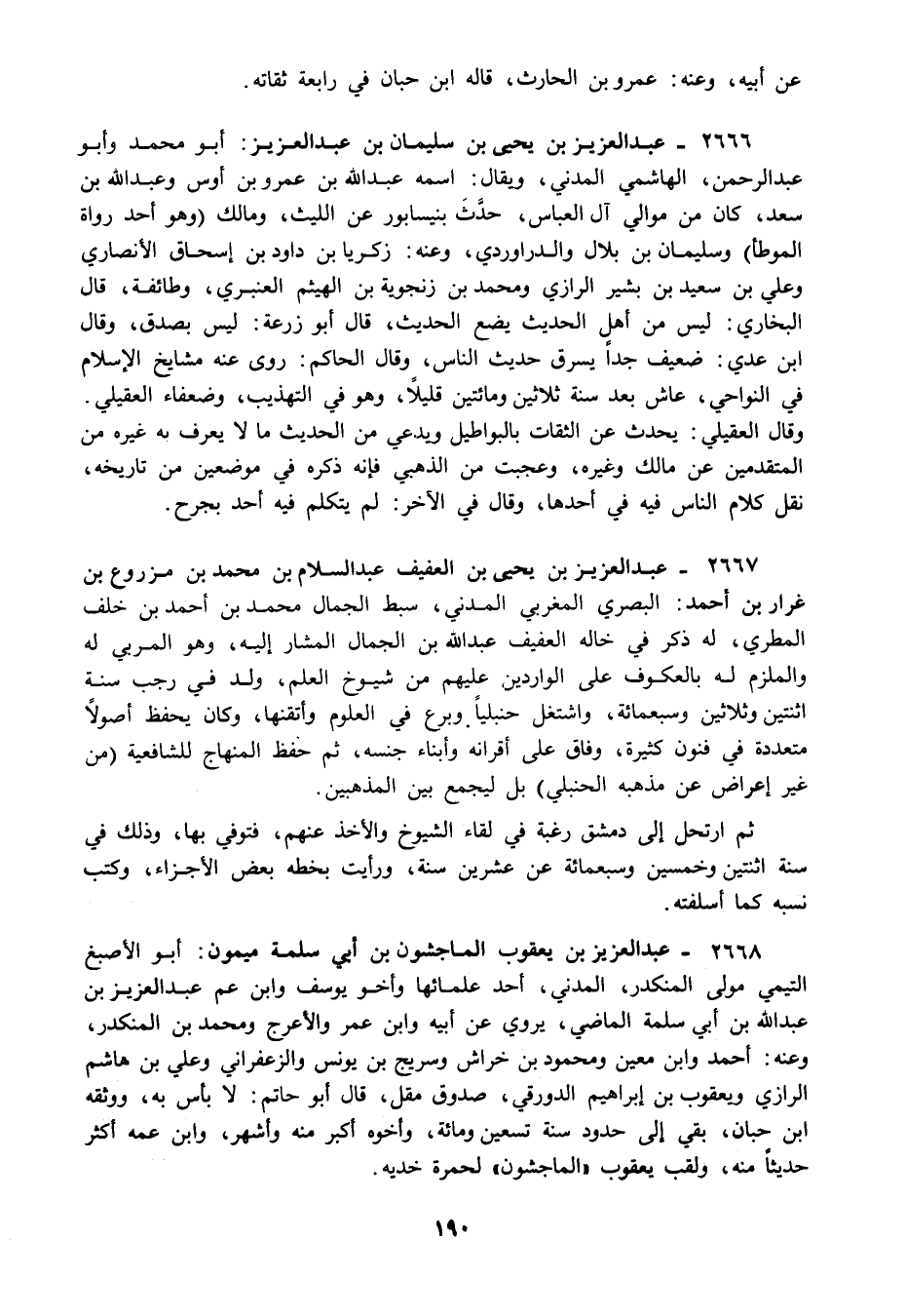 2668 - عبد العزيز بن يعقوب الماجشون بن أبي سلمة ميمون: أبو الأصبغ التيمي مولى المنكدر المدني أحد علمائها وأخو يوسف وابن عم عبد العزيز بن عبد الله بن أبي سلمة الماضي يروي عن أبيه وابن عمر والأعرج ومحمد بن المنكدر وعنه: أحمد وابن معين ومحمود بن خراش وسريج بن يونس والزعفراني وعلي بن هاشم الرازي ويعقوب بن إبراهيم الدورقي صدوق مقل قال أبو حاتم: لا بأس به ووثقه ابن حبان بقي إلى حدود سنة تسعين ومائة وأخوه أكبر منه وأشهر وابن عمه أكثر حديثا منه ولقب يعقوب "الماجشون" لحمرة خديه.