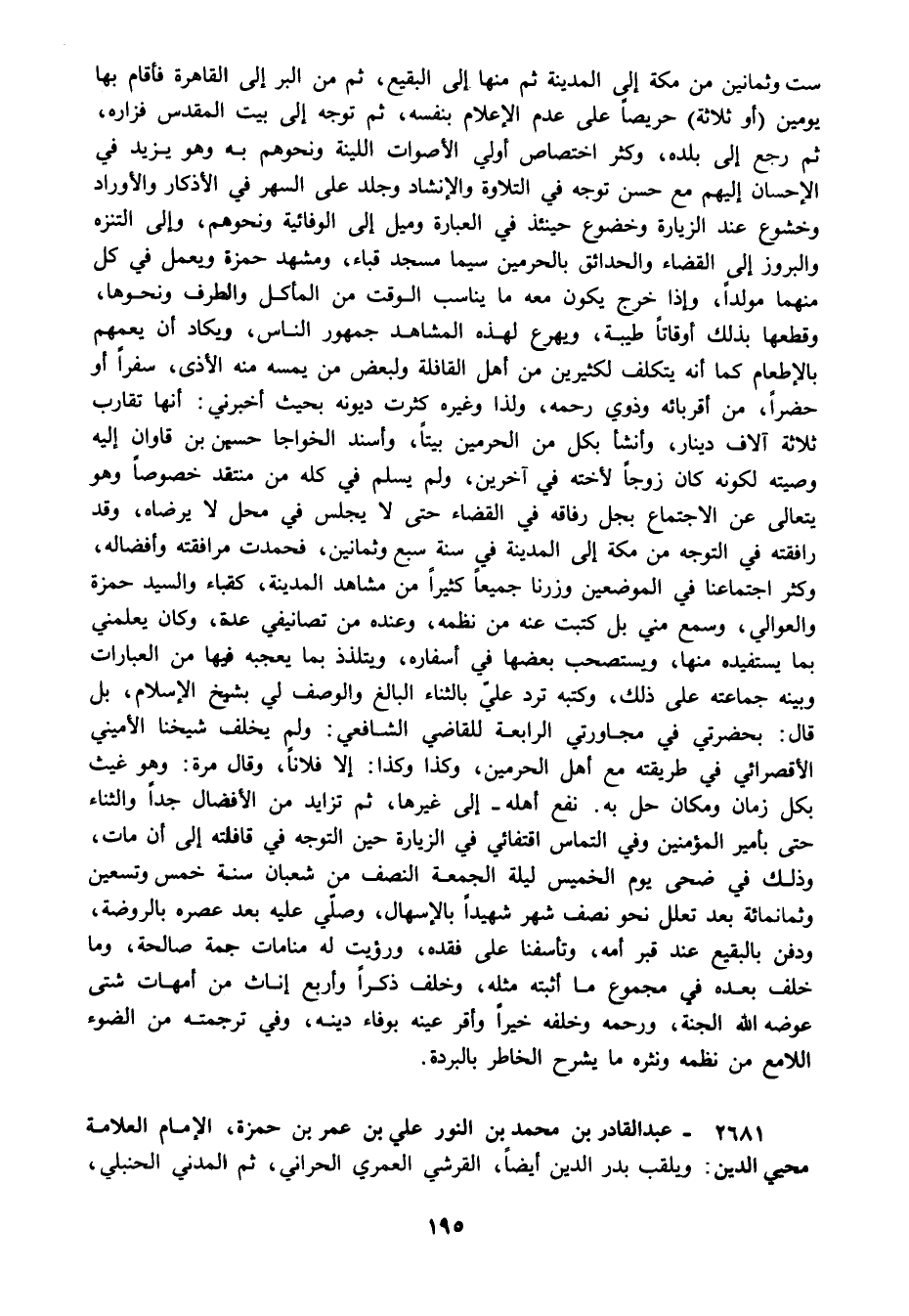 2681 - عبد القادر بن محمد بن النور علي بن عمر بن حمزة الإمام العلامة محيي الدين: ويلقب بدر الدين أيضا القرشي العمري الحراني ثم المدني الحنبلي