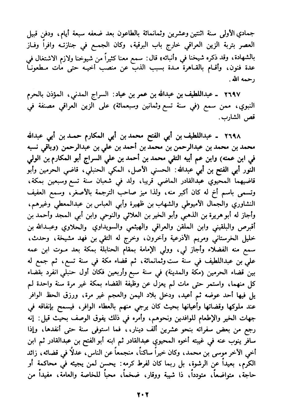 2698 - عبد اللطيف بن أبي الفتح محمد بن أبي المكارم حمد بن أبي عبد الله محمد بن محمد بن عبد الرحمن بن محمد بن أحمد بن علي بن عبد الرحمن وباقي نسبه في ابن عمته وابن عم أبيه التقي محمد بن أحمد بن علي السراج أبو المكارم بن الولي النور أبي الفتح بن أبي عبد الله: الحسني الأصل المكي الحنبلي قاضي الحرمين وأبو قاضيهما المحيوي عبد القادر الماضي قريبا ولد في شعبان سنة تسع وسبعين بمكة وتسمى باسم أخ له كان أكبر منه ولذا ميز صاحب الترجمة بالأصغر وسمع العفيف النشاوري والجمال الأميوطي والشهاب بن ظهيرة وأبي العباس بن عبد المعطي وغيرهم وأجاز له أبو هريرة بن الذهبي وأبو الخير بن العلائي والنوحي وابن أبي المجد وأحمد بن أقبرص والبلقيني وابن الملقن والعراقي والهيثمي والسويداوي والحلاوي وعبد الله بن خليل الخرستاني ومريم الأذرعية وآخرون وخرج له التقي بن فهد مشيخة وحدث سمع منه الفضلاء وأجاز لي وولي الإمامة بمقام الحنابلة بمكة بعد موت ابن عمه علي بن عبد اللطيف في سنة ست وثمانمائة ثم قضاء مكة في سنة تسع ثم جمع له بين قضاء الحرمين مكة والمدينة في سنة سبع وأربعين فكان أول حنبلي انفرد بقضاء كل منهما واستمر حتى مات لم يعزل عن وظيفة القضاء بمكة غير مرة سنة واحدة لم يل فيها أحد عوضه ثم أعيد ودخل بلاد اليمن والعجم غير مرة ورزق الحظ الوافر عند ملوكها وقضاتها وأعيانها بحيث كان يرجي منهم بالعطاء الوافر فيسمح بإنفاقه في جهات الخير والإطعام للوافدين ونحوهم وأمره في ذلك يفوق الوصف بحيث قيل إنه رجع من بعض سفراته بنحو عشرين ألف دينار فما استوفى سنة حتى أنفدها وإذا سافر ينوب عنه في غيبته أخوه المحيوي عبد القادر ثم ابنه أبو الفتح بن عبد القادر ثم ابن أخي الآخر موسى بن محمد وكان خيرا ساكنا منجمعا عن الناس عدلا في قضائه زائد الكرم بعيدا عن الرشوة بل ربما كان لفرط كرمه: يحسن لمن يجيئه في محاكمة أو حاجة متواضعا متوددا ذا شيبة ووقار ضخما محبا للخاصة والعامة مفيدا من