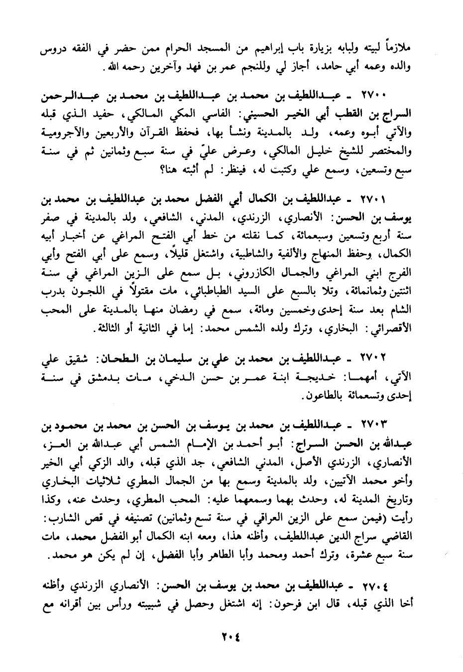 2704 - عبد اللطيف بن محمد بن يوسف بن الحسن: الأنصاري الزرندي وأظنه أخا الذي قبله قال ابن فرحون: إنه اشتغل وحصل في شبيبته ورأس بين أقرانه مع