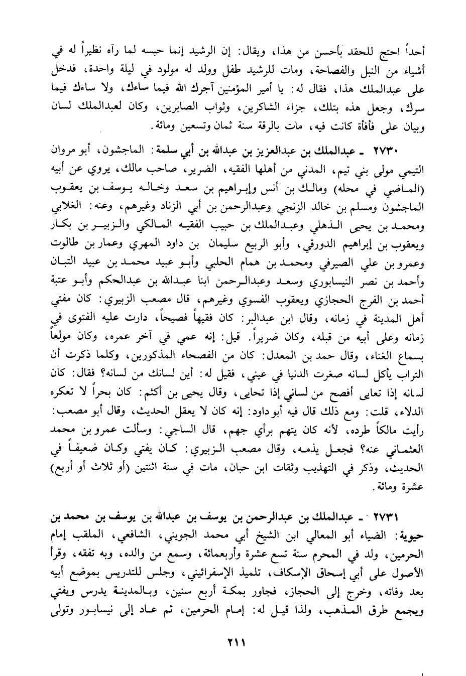 2730 - عبد الملك بن عبد العزيز بن عبد الله بن أبي سلمة: الماجشون أبو مروان التيمي مولى بني تيم المدني من أهلها الفقيه الضرير صاحب مالك يروي عن أبيه الماضي في محله ومالك بن أنس وإبراهيم بن سعد وخاله يوسف بن يعقوب الماجشون ومسلم بن خالد الزنجي وعبد الرحمن بن أبي الزناد وغيرهم وعنه: الغلابي ومحمد بن يحيى الذهلي وعبد الملك بن حبيب الفقيه المالكي والزبير بن بكار ويعقوب بن إبراهيم الدورقي وأبو الربيع سليمان بن داود المهري وعمار بن طالوت وعمرو بن علي الصيرفي ومحمد بن همام الحلبي وأبو عبيد محمد بن عبيد التبان وأحمد بن نصر النيسابوري وسعد وعبد الرحمن ابنا عبد الله بن عبد الحكم وأبو عتبة أحمد بن الفرج الحجازي ويعقوب الفسوي وغيرهم, قال مصعب الزبيري: كان مفتي أهل المدينة في زمانه وقال ابن عبد البر: كان فقيها فصيحا دارت عليه الفتوى في زمانه وعلى أبيه من قبله وكان ضريرا قيل: إنه عمي في آخر عمره وكان مولعا بسماع الغناء وقال حمد بن المعدل: كان من الفصحاء المذكورين وكلما ذكرت أن التراب يأكل لسانه صغرت الدنيا في عيني فقيل له: أين لسانك من لسانه؟ فقال: كان لسانه إذا تعايى أفصح من لساني إذا تحايى وقال يحيى بن أكثم: كان بحرا لا تعكره الدلاء قلت: ومع ذلك قال فيه أبو داود: إنه كان لا يعقل الحديث وقال أبو مصعب: رأيت مالكا طرده لأنه كان يتهم برأي جهم قال الساجي: وسألت عمرو بن محمد العثماني عنه؟ فجعل يذمه وقال مصعب الزبيري: كان يفتي وكان ضعيفا في الحديث وذكر في التهذيب وثقات ابن حبان مات في سنة اثنتين أو ثلاث أو أربع عشرة ومائة.