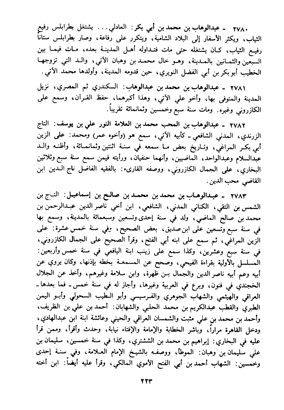 2780 - عبد الوهاب بن محمد بن أبي بكر: العادلي ... يشتغل بطرابلس رفيع الثياب ويكثر الأسفار إلى البلاد الشامية ويتكرر على رفاعة وصار بطرابلس ستانا رفيع الثياب كان يشتغله حتى مات فتداوله أهل المدينة بعده مات فيما بين السبعين والثمانين بالمدينة وهو خال محمد بن وهبان الآتي والد التي تزوجها الخطيب أبو بكر بن أبي الفضل النويري حين قدومه المدينة وأولدها محمد الآتي.