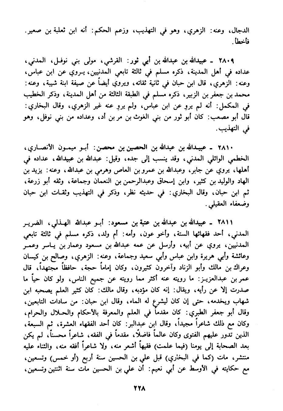 2809 - عبيد الله بن عبد الله بن أبي ثور: القرشي مولى بني نوفل المدني عداده في أهل المدينة ذكره مسلم في ثالثة تابعي المدنيين يروي عن ابن عباس وعنه: الزهري قال ابن حبان في ثانية ثقاته ويروي أيضا عن صيفة ابنة شيبة وعنه: محمد بن جعفر بن الزبير ذكره مسلم في الطبقة الثالثة من أهل المدينة وذكر الخطيب في المكمل: أنه لم يرو عن ابن عباس ولم يرو عنه غير الزهري وقال البخاري: قال أبو مصعب: كان أبو ثور من بني الغوث بن مر بن أد وعداده من بني نوفل وهو في التهذيب.