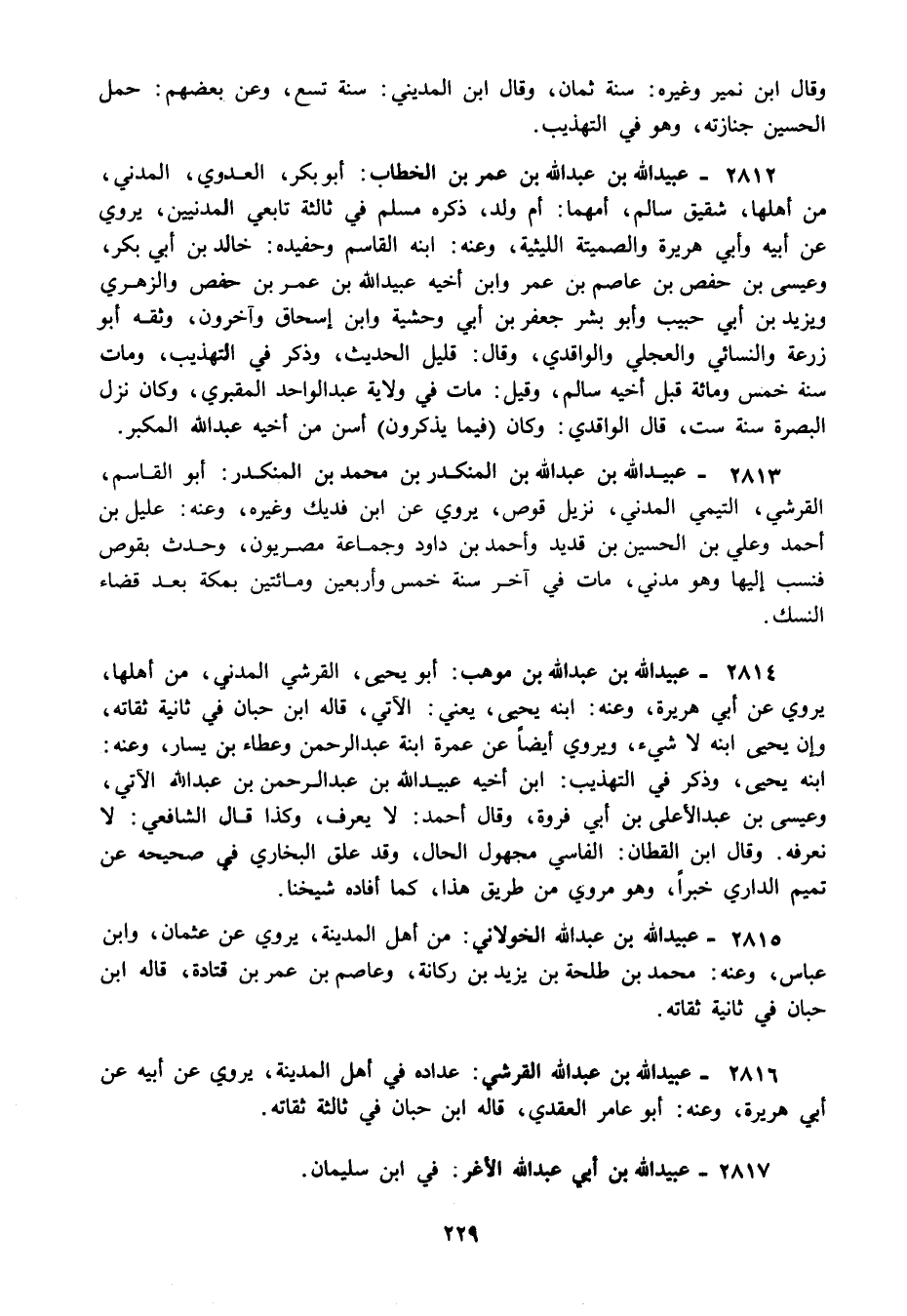 2816 - عبيد الله بن عبد الله القرشي: عداده في أهل المدينة يروي عن أبيه عن أبي هريرة وعنه: أبو عامر العقدي قاله ابن حبان في ثالثة ثقاته.