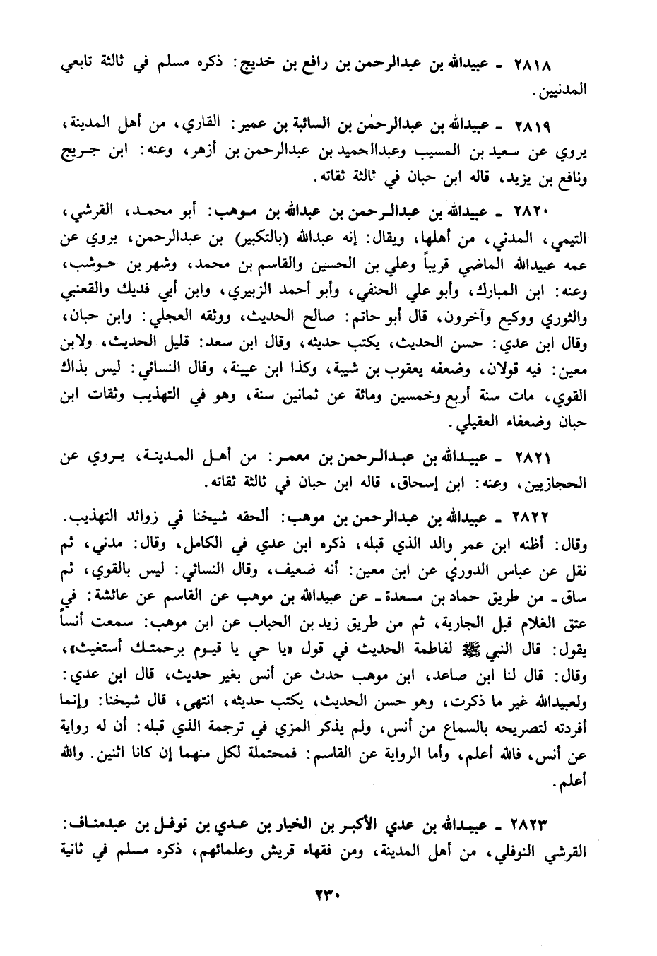2818 - عبيد الله بن عبد الرحمن بن رافع بن خديج: ذكره مسلم في ثالثة تابعي المدنيين.