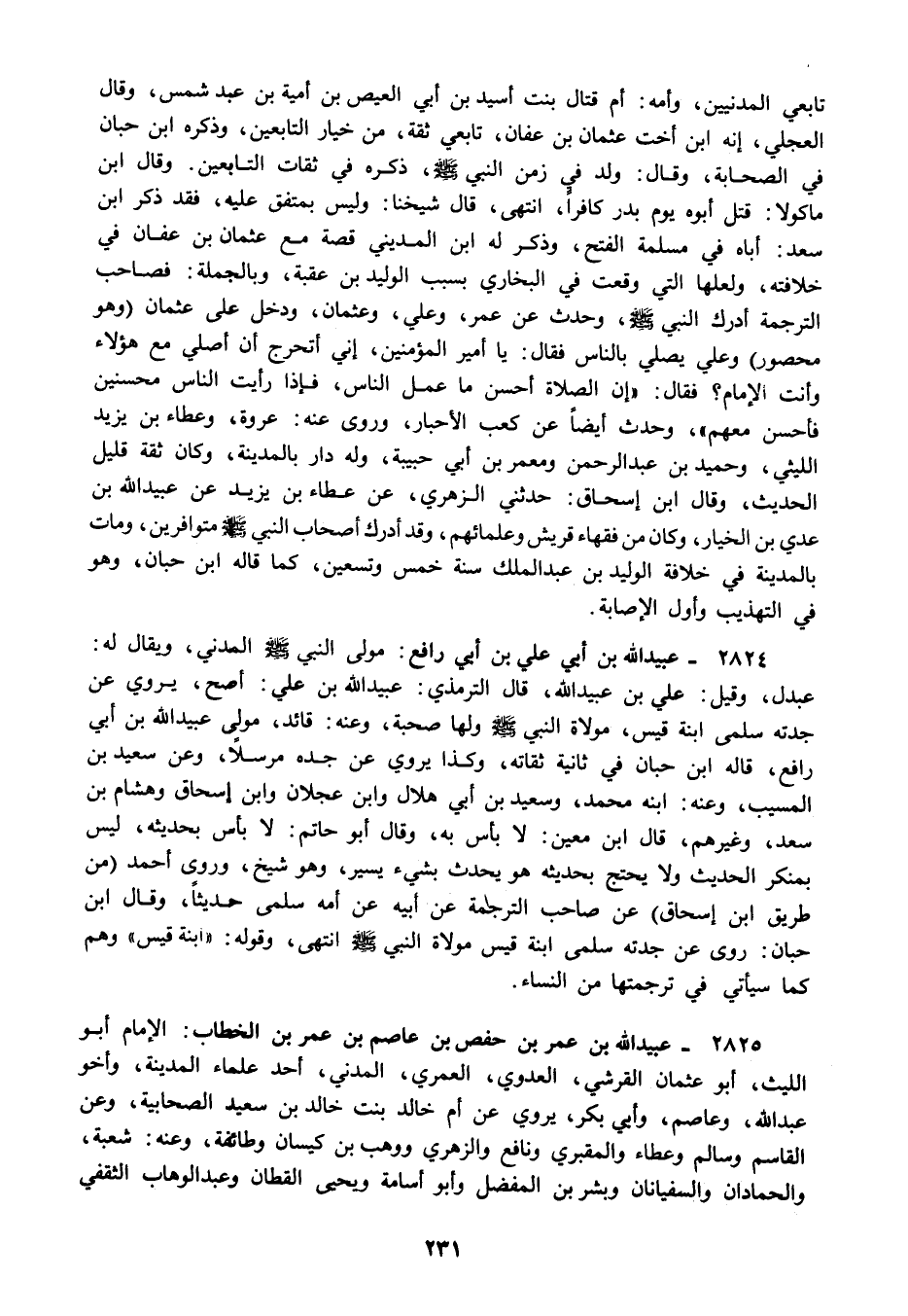 2825 - عبيد الله بن عمر بن حفص بن عاصم بن عمر بن الخطاب: الإمام أبو الليث أبو عثمان القرشي العدوي العمري المدني أحد علماء المدينة وأخو عبد الله وعاصم وأبي بكر يروي عن أم خالد بنت خالد بن سعيد الصحابية وعن القاسم وسالم وعطاء والمقبري ونافع والزهري ووهب بن كيسان وطائفة وعنه: شعبة والحمادان والسفيانان وبشر بن المفضل وأبو أسامة ويحيى القطان وعبد الوهاب الثقفي