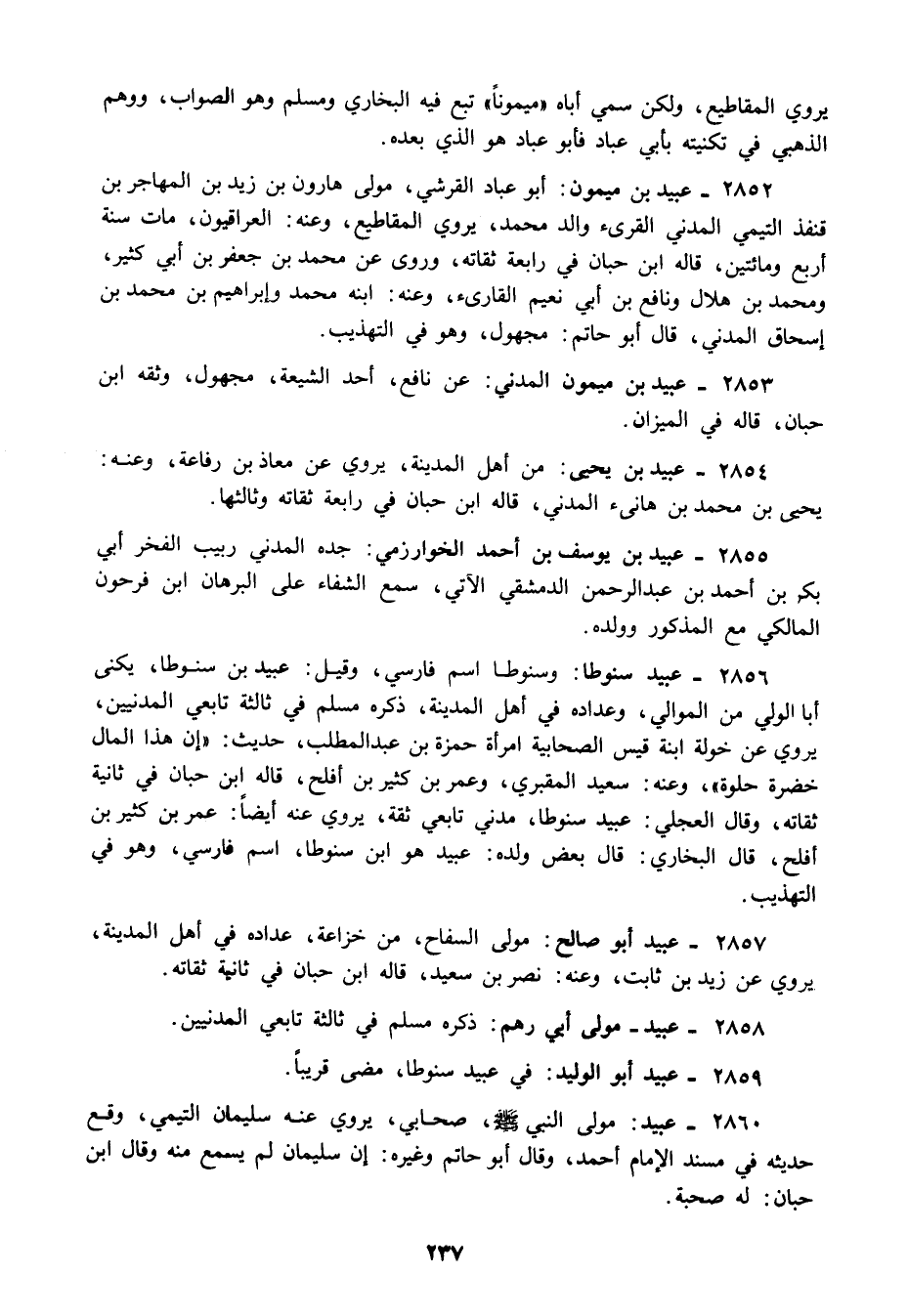 2857 – عبيد أبو صالح: مولى السفاح من خزاعة عداده في أهل المدينة يروي عن زيد بن ثابت وعنه: نصر بن سعيد قاله ابن حبان في ثانية ثقاته.