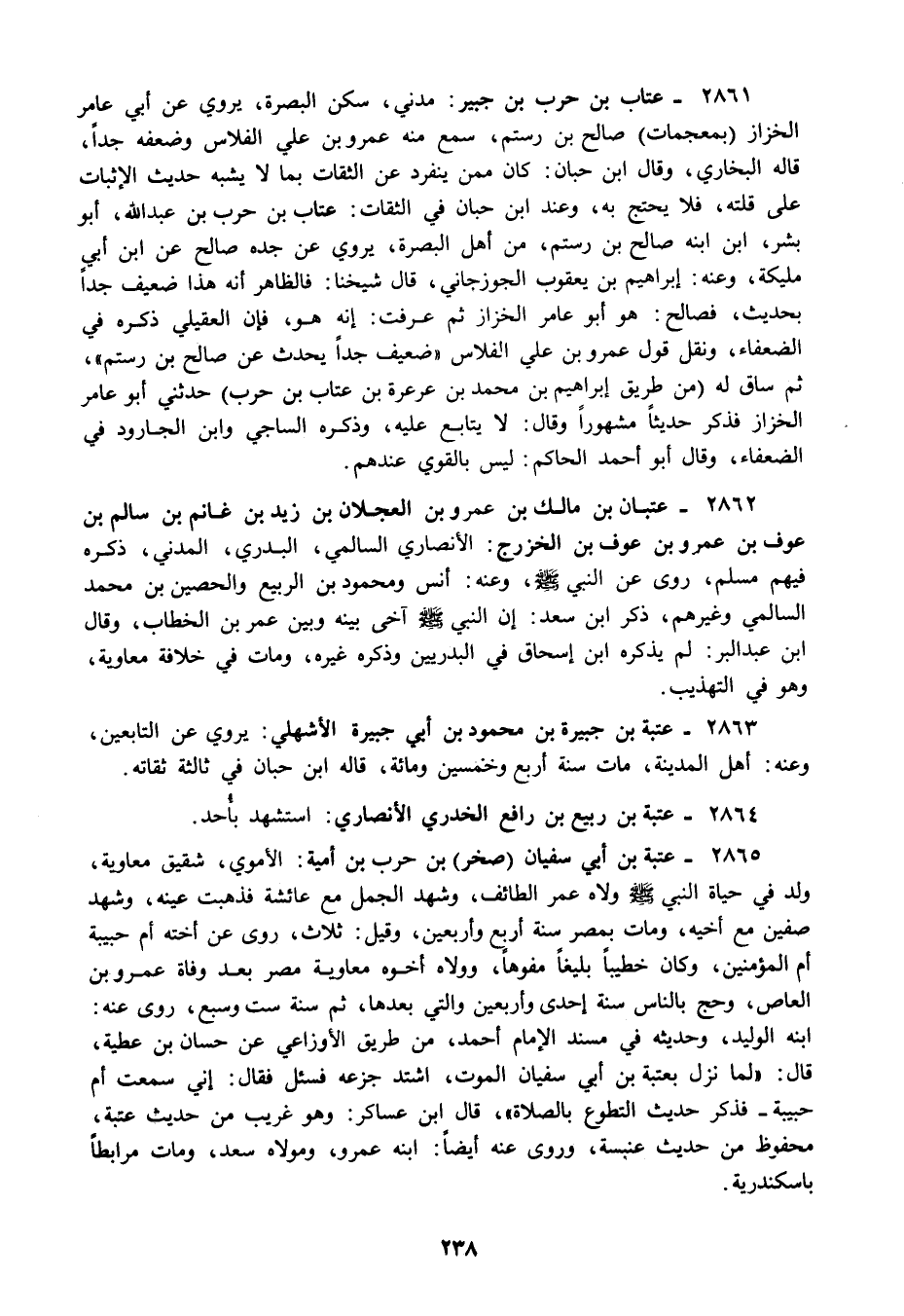 2861 - عتاب بن حرب بن جبير: مدني سكن البصرة يروي عن أبي عامر الخزاز بمعجمات صالح بن رستم سمع منه عمرو بن علي الفلاس وضعفه جدا قاله البخاري وقال ابن حبان: كان ممن ينفرد عن الثقات بما لا يشبه حديث الإثبات على قلته فلا يحتج به وعند ابن حبان في الثقات: عتاب بن حرب بن عبد الله أبو بشر ابن ابنه صالح بن رستم من أهل البصرة يروي عن جده صالح عن ابن أبي مليكة وعنه إبراهيم بن يعقوب الجوزجاني قال شيخنا: فالظاهر أنه هذا ضعيف جدا بحديث فصالح: هو أبو عامر الخزاز ثم عرفت: إنه هو فإن العقيلي ذكره في الضعفاء ونقل قول عمرو بن علي الفلاس "ضعيف جدا يحدث عن صالح بن رستم" ثم ساق له من طريق إبراهيم بن محمد بن عرعرة بن عتاب بن حرب حدثني أبو عامر الخزاز فذكر حديثا مشهورا وقال: لا يتابع عليه وذكره الساجي وابن الجارود في الضعفاء وقال أبو أحمد الحاكم: ليس بالقوي عندهم.