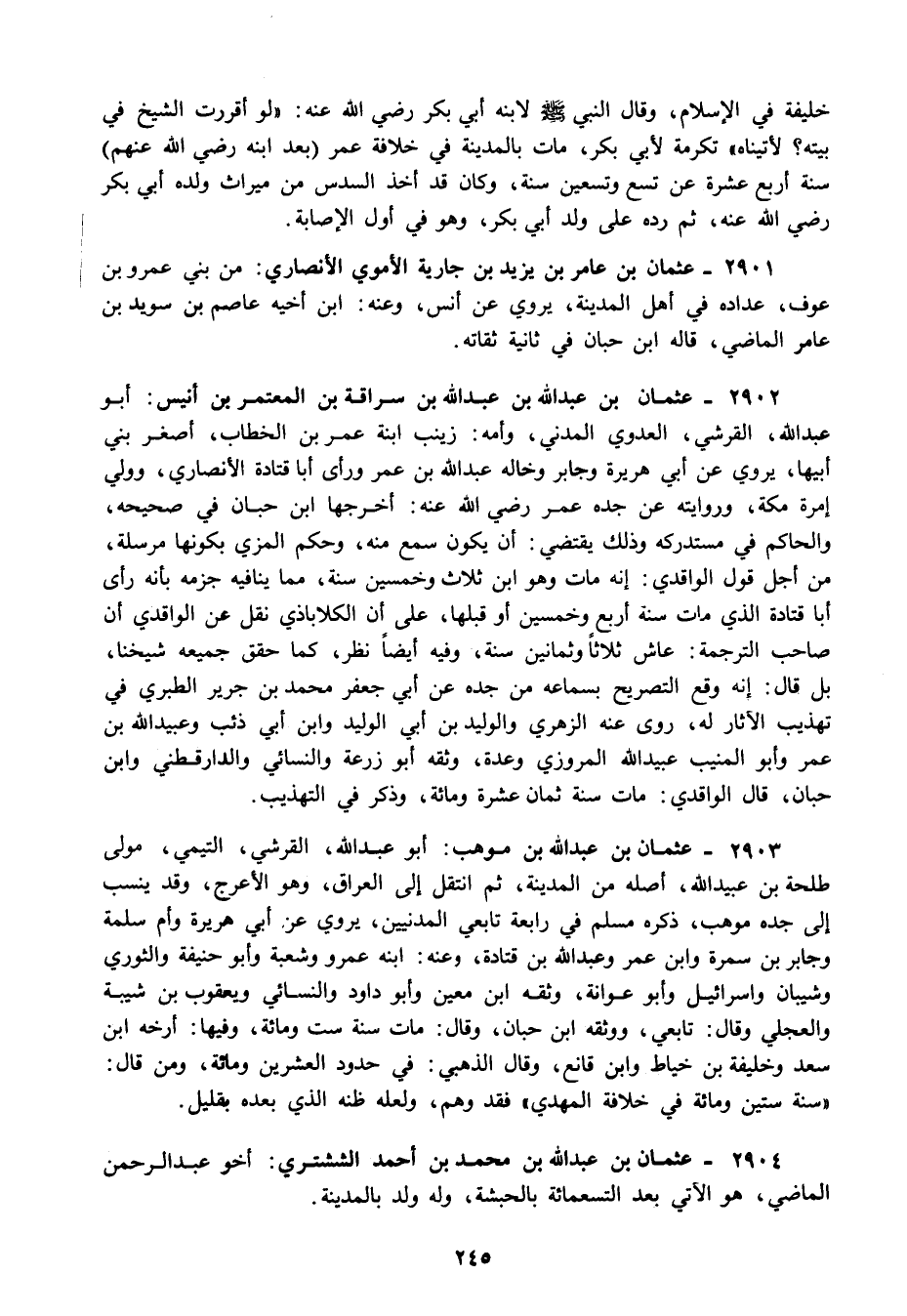 2902 - عثمان بن عبد الله بن عبد الله بن سراقة بن المعتمر بن أنيس: أبو عبد الله القرشي العدوي المدني وأمه: زينب ابنة عمر بن الخطاب أصغر بني أبيها يروي عن أبي هريرة وجابر وخاله عبد الله بن عمر ورأى أبا قتادة الأنصاري وولي إمرة مكة وروايته عن جده عمر رضي الله عنه: أخرجها ابن حبان في صحيحه والحاكم في مستدركه وذلك يقتضي: أن يكون سمع منه وحكم المزي بكونها مرسلة من أجل قول الواقدي: إنه مات وهو ابن ثلاث وخمسين سنة مما ينافيه جزمه بأنه رأى أبا قتادة الذي مات سنة أربع وخمسين أو قبلها على أن الكلاباذي نقل عن الواقدي أن صاحب الترجمة: عاش ثلاثا وثمانين سنة وفيه أيضا نظر كما حقق جميعه شيخنا بل قال: إنه وقع التصريح بسماعه من جده عن أبي جعفر محمد بن جرير الطبري في تهذيب الآثار له روى عنه الزهري والوليد بن أبي الوليد وابن أبي ذئب وعبيد الله بن عمر وأبو المنيب عبيد الله المروزي وعدة وثقه أبو زرعة والنسائي والدارقطني وابن حبان قال الواقدي: مات سنة ثمان عشرة ومائة وذكر في التهذيب.