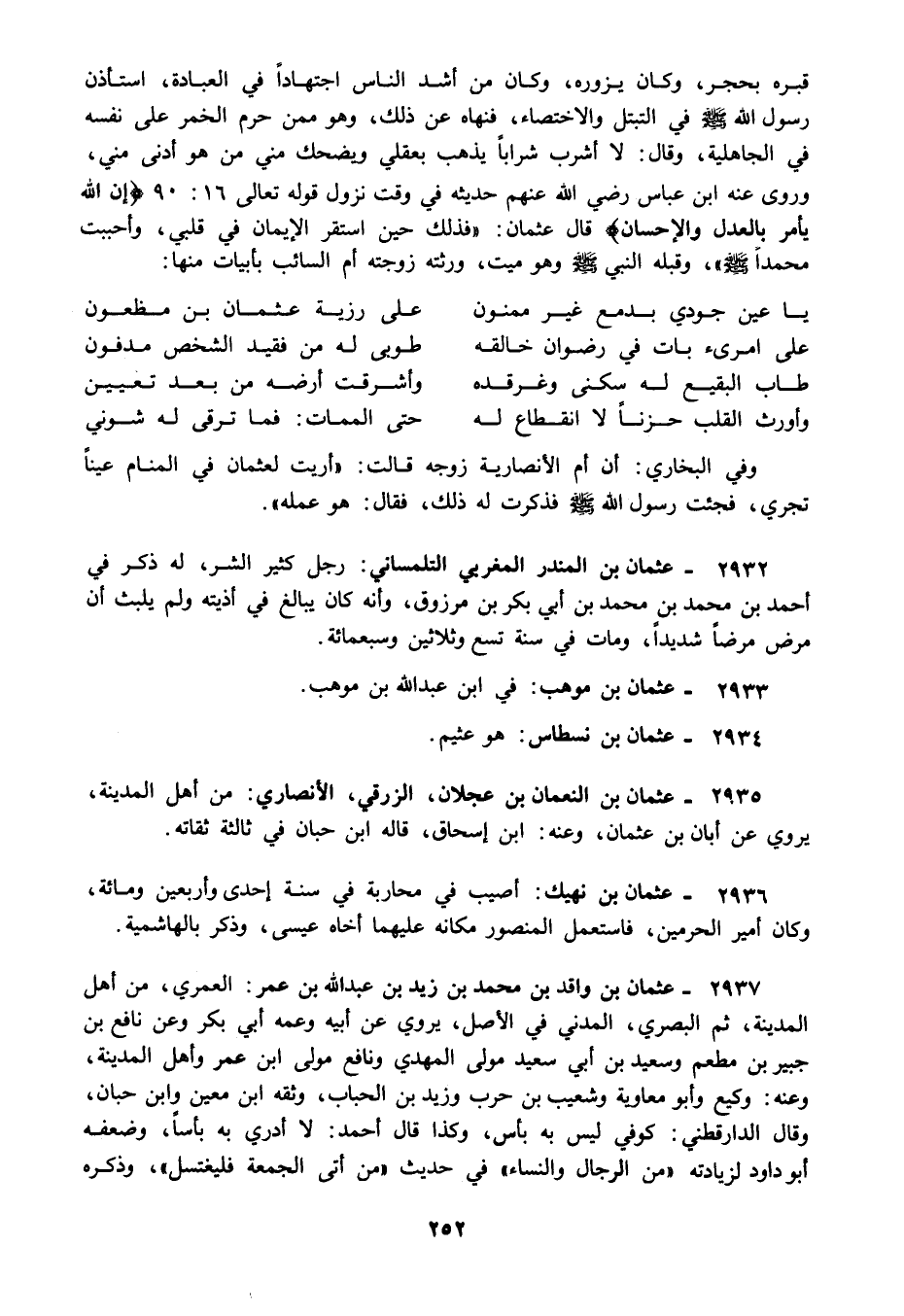 2936 - عثمان بن نهيك: أصيب في محاربة في سنة إحدى وأربعين ومائة وكان أمير الحرمين فاستعمل المنصور مكانه عليهما أخاه عيسى وذكر بالهاشمية.