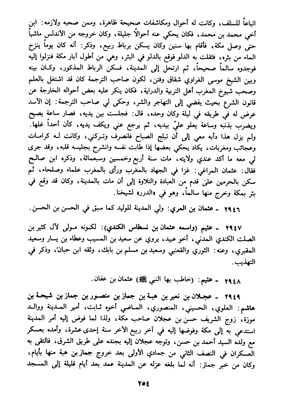 2949 - عجلان بن نعير بن هبة بن جماز بن منصور بن جماز بن شيحة بن هاشم: العلوي الحسيني المنصوري الماضي أخوه ثابت أمير المدينة ووالد موزة زوج الشريف حسن بن عجلان صاحب مكة ولذا لما فوض إليه أمر المدينة استدعي به إلى مكة وفوضها إليه في آخر ربيع الآخرة سنة إحدى عشرة وأمده بعسكر مع ولده السيد أحمد بن حسن وتوجه عجلان إليه بجنده على طريق الشرق فالتقى به العسكران في النصف الثاني من جمادي الأولى بعد خروج جماز بن هبة منها بأيام وكان من خبر جماز: أنه لما بلغه عزله عن المدينة عمد بعد أيام قليلة إلى المسجد