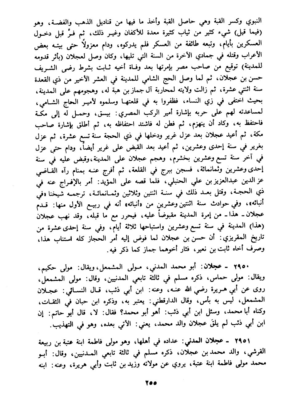 2951 - عجلان المدني: عداده في أهلها وهو مولى فاطمة ابنة عتبة بن ربيعة القرشي والد محمد بن عجلان ذكره مسلم في ثالثة تابعي المدنيين وقال: أبو محمد مولى فاطمة ابنة عتبة يروي عن مولاته وزيد بن ثابت وأبي هريرة وعنه: ابنه