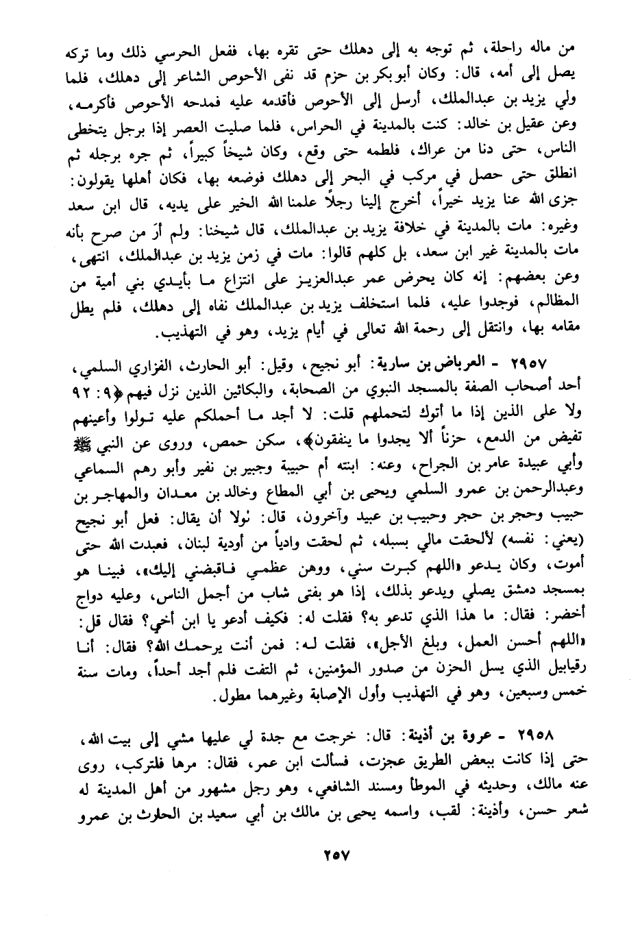 2957 - العرباض بن سارية: أبو نجيح وقيل: أبو الحارث الفزاري السلمي أحد أصحاب الصفة بالمسجد النبوي من الصحابة والبكائين الذين نزل فيهم {وَلا عَلَى الَّذِينَ إِذَا مَا أَتَوْكَ لِتَحْمِلَهُمْ قُلْتَ لا أَجِدُ مَا أَحْمِلُكُمْ عَلَيْهِ تَوَلَّوْا وَأَعْيُنُهُمْ تَفِيضُ مِنَ الدَّمْعِ حَزَناً أَلّا يَجِدُوا مَا يُنْفِقُونَ} سكن حمص وروى عن النبي صلى الله عليه وسلم وأبي عبيدة عامر بن الجراح وعنه: ابنته أم حبيبة وجبير بن نفير وأبو رهم السماعي وعبد الرحمن بن عمرو السلمي ويحيى بن أبي المطاع وخالد بن معدان والمهاجر بن حبيب وحجر بن حجر وحبيب بن عبيد وآخرون قال: لولا أن يقال: فعل أبو نجيح "يعني: نفسه" لألحقت مالي بسبله ثم لحقت واديا من أودية لبنان فعبدت الله حتى أموت وكان يدعو "اللهم كبرت سني ووهن عظمي فاقبضني إليك" فبينا هو بمسجد دمشق يصلي ويدعو بذلك إذا هو بفتى شاب من أجمل الناس وعليه دواج أخضر: فقال: ما هذا الذي تدعو به؟ فقلت له: فكيف أدعو يا ابن أخي؟ فقال قل: "اللهم أحسن العمل وبلغ الأجل" فقلت له: فمن أنت يرحمك الله؟ فقال: أنا رقيابيل الذي يسل الحزن من صدور المؤمنين ثم التفت فلم أجد أحدا ومات سنة خمس وسبعين وهو في التهذيب وأول الإصابة وغيرهما مطول.