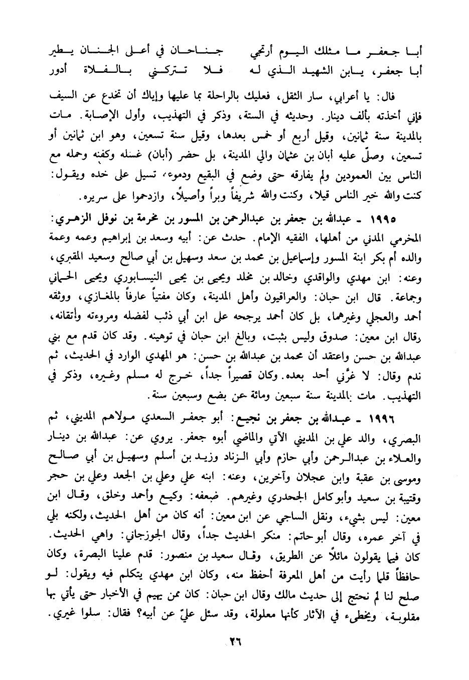 1995 - عبد الله بن جعفر بن عبد الرحمن بن المسور بن مخرمة بن نوفل الزهري: المخرمي المدني من أهلها الفقيه الإمام حدث عن: أبيه وسعد بن إبراهيم وعمه وعمة والده أم بكر ابنة المسور وإسماعيل بن محمد بن سعد وسهيل بن أبي صالح وسعيد المقبري, وعنه: ابن مهدي والواقدي وخالد بن مخلد ويحيى بن يحيى النيسابوري ويحيى الحماني وجماعة. قال ابن حبان: والعراقيون وأهل المدينة وكان مفتيا عارفا بالمغازي ووثقه أحمد والعجلي وغيرهما بل كان أحمد يرجحه على ابن أبي ذئب لفضله ومروءته وإتقانه وقال ابن معين: صدوق وليس بثبت وبالغ ابن حبان في توهينه وقد كان قدم مع بني عبد الله بن حسن واعتقد أن محمد بن عبد الله بن حسن هو المهدي الوارد في الحديث ثم ندم وقال: لا غرني أحد بعده وكان قصيرا جدا خرج له مسلم وغيره وذكر في التهذيب. مات بالمدينة سنة سبعين ومائة عن بضع وسبعين سنة.