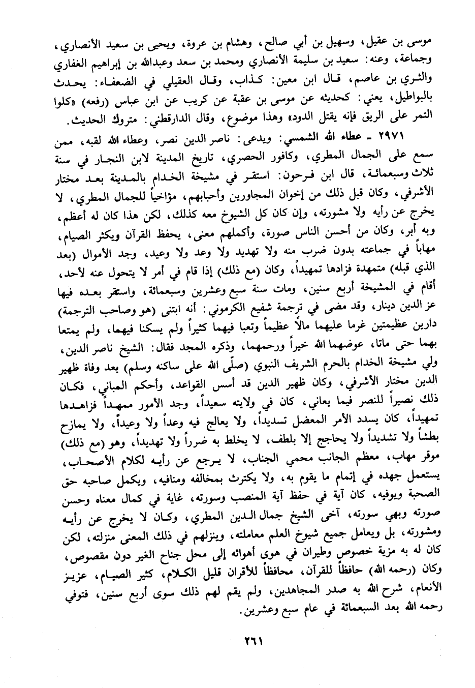 2971 - عطاء الله الشمسي: ويدعى: ناصر الدين نصر وعطاء الله لقبه ممن سمع على الجمال المطري وكافور الحصري تاريخ المدينة لابن النجار في سنة ثلاث وسبعمائة قال ابن فرحون: استقر في مشيخة الخدام بالمدينة بعد مختار الأشرفي وكان قبل ذلك من إخوان المجاورين وأحبابهم مؤاخيا للجمال المطري لا يخرج عن رأيه ولا مشورته وإن كان كل الشيوخ معه كذلك لكن هذا كان له أعظم وبه أبر وكان من أحسن الناس صورة وأكملهم معنى يحفظ القرآن ويكثر الصيام مهابا في جماعته بدون ضرب منه ولا تهديد ولا وعد ولا وعيد وجد الأموال "بعد الذي قبله" متمهدة فزادها تمهيدا وكان "مع ذلك" إذا قام في أمر لا يتحول عنه لأحد أقام في المشيخة أربع سنين ومات سنة سبع وعشرين وسبعمائة واستقر بعده فيها عز الدين دينار وقد مضى في ترجمة شفيع الكرموني: أنه ابتنى "هو وصاحب الترجمة" دارين عظيمتين غرما عليهما مالا عظيما وتعبا فيهما كثيرا ولم يسكنا فيهما ولم يمتعا بهما حتى ماتا عوضهما الله خيرا ورحمهما وذكره المجد فقال: الشيخ ناصر الدين ولي مشيخة الخدام بالحرم الشريف النبوي "صلى الله على ساكنه وسلم" بعد وفاة ظهير الدين مختار الأشرفي وكان ظهير الدين قد أسس القواعد وأحكم المباني فكان ذلك نصيرا للنصر فيما يعاني كان في ولايته سعيدا وجد الأمور ممهدا فزاهدها تمهيدا كان يسدد الأمر المعضل تسديدا ولا يعالج فيه وعدا ولا وعيدا ولا يمازح بطشا ولا تشديدا ولا يحاجج إلا بلطف لا يخلط به ضررا ولا تهديدا وهو "مع ذلك" موقر مهاب معظم الجانب محمي الجناب لا يرجع عن رأيه لكلام الأصحاب يستعمل جهده في إتمام ما يقوم به ولا يكترث بمخالفه ومنافيه ويكمل صاحبه حق الصحبة ويوفيه كان آية في حفظ آية المنصب وسورته غاية في كمال معناه وحسن صورته وبهي سورته آخى الشيخ جمال الدين المطري وكان لا يخرج عن رأيه ومشورته بل ويعامل جميع شيوخ العلم معاملته وينزلهم في ذلك المعنى منزلته لكن كان له به مزية خصوص وطيران في هوى أهوائه إلى محل جناح الغير دون مقصوص وكان "رحمه الله" حافظا للقرآن محافظا للأقران قليل الكلام كثير الصيام عزيز الأنعام شرح الله به صدر المجاهدين ولم يقم لهم ذلك سوى أربع سنين فتوفي رحمه الله بعد السبعمائة في عام سبع وعشرين.