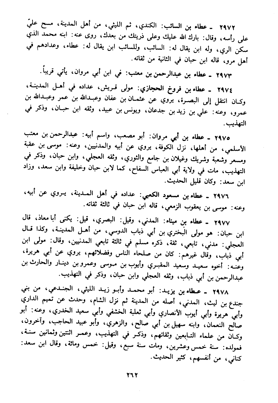 2972 - عطاء بن السائب: الكندي ثم الليثي من أهل المدينة مسح علي على رأسه وقال: بارك الله عليك وعلى ذريتك من بعدك روى عنه: ابنه محمد الذي سكن الري وله ابن يقال له السائب وللسائب ابن يقال له: عطاء وعدادهم في أهل مرو قاله ابن حبان في الثانية من ثقاته.