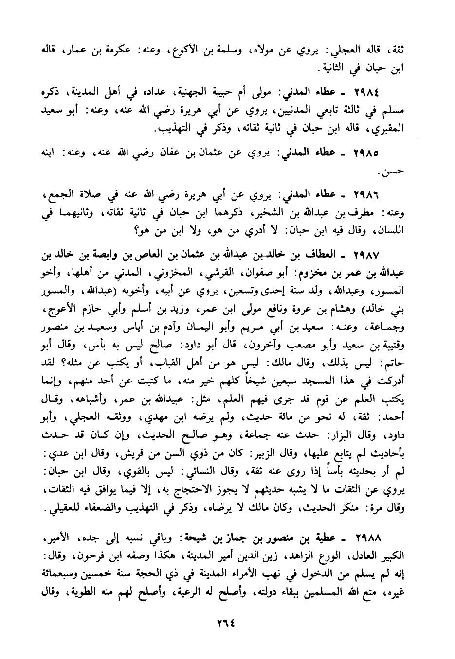 2986 - عطاء المدني: يروي عن أبي هريرة رضي الله عنه في صلاة الجمع وعنه: مطرف بن عبد الله بن الشخير ذكرهما ابن حبان في ثانية ثقاته وثانيهما في اللسان وقال فيه ابن حبان: لا أدري من هو ولا ابن من هو؟.